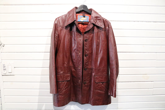 Mountaineer-Leathers Inc Burgundy Leather Jacket | Vintage 1970s Long Button-Up Coat | Classic Outerwear