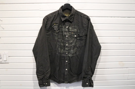 Projekt-RAW Button-Up Shirt | Vintage Graphic Patchwork Long Sleeve Shirt | Distressed Eagle Design