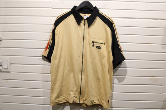 JNCO Zip Polo Shirt | Vintage 90s Colorblock Short Sleeve Top with Tribal Sleeve Details | Men's Street Casualwear