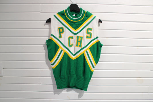 PCHS Cheerleader Sweater Vest | Vintage 70s-80s School Spirit Knit | Green And Yellow Pom Squad Top | Retro Cheer Uniform