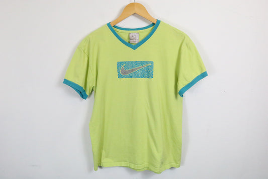 Nike T-Shirt | Vintage 90s Blue-Trim V-Neck Graphic Tee | Bright Green Classic Sportswear