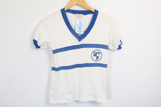 Puch Shield Stripe T-Shirt | Vintage 70s Blue-White V-Neck Logo Tee | Classic Motorsport Graphic Top