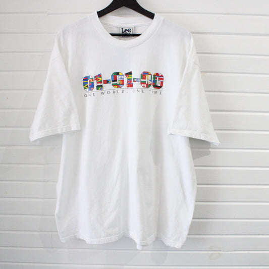Y2K T-Shirt | Vintage '90s One-World-One-Time Millennium Graphic Tee | 01-01-00 International Flags Print 2XL