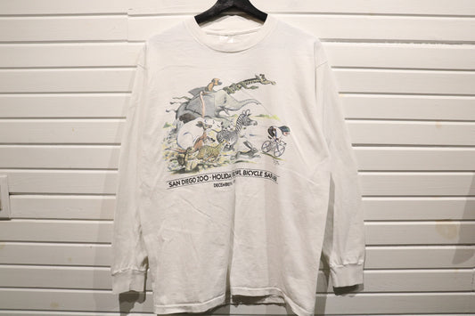 San-Diego Zoo Long Sleeve T-Shirt | Vintage 1990s Holiday-Bowl Bicycle Safari Animal Graphic Tee | Classic Zoo Event Wear