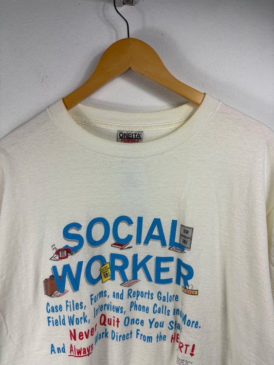 Social Worker Graphic T-Shirt | Vintage 1990s Illustrated Print Tee | Profession Theme Top