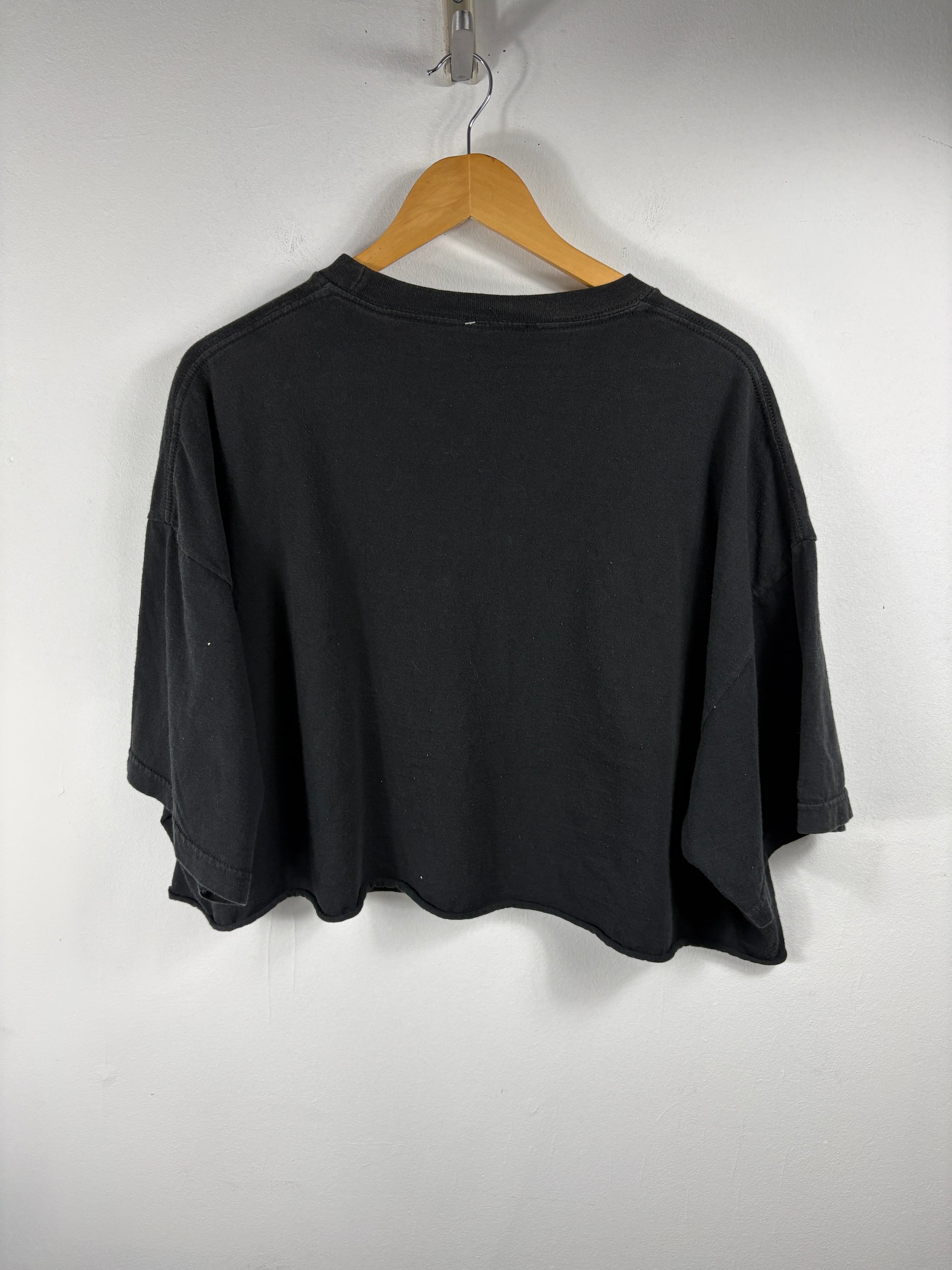 Vintage black cropped t-shirt with bold front slogan and humorous graphic design.