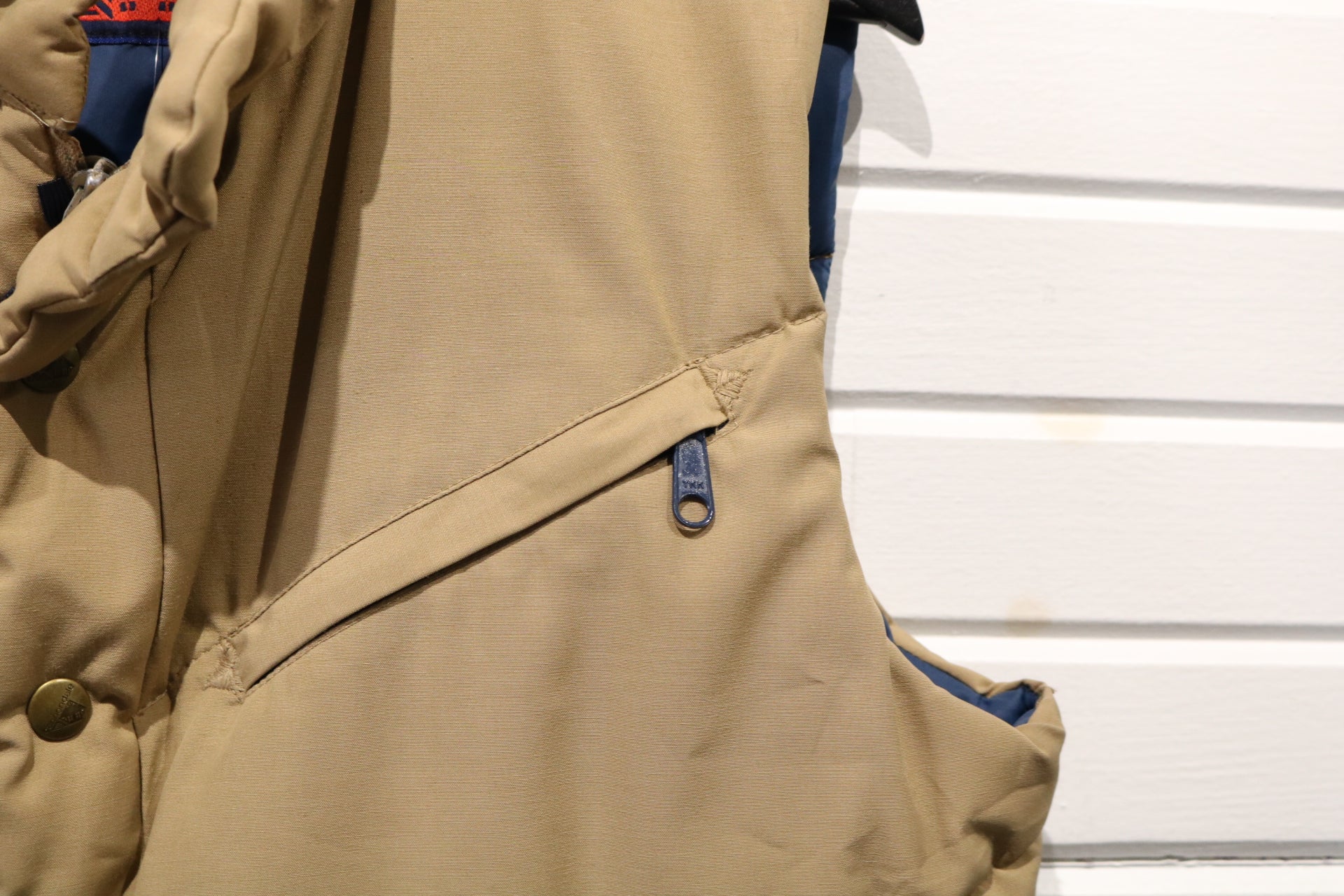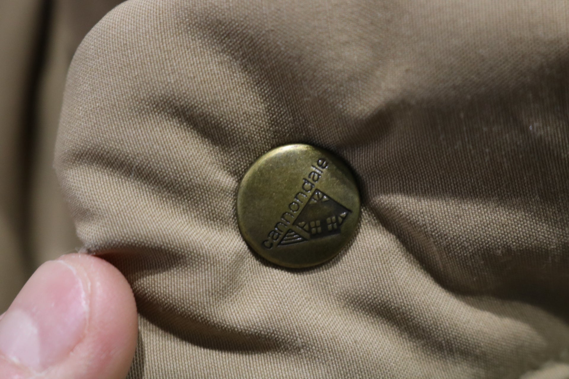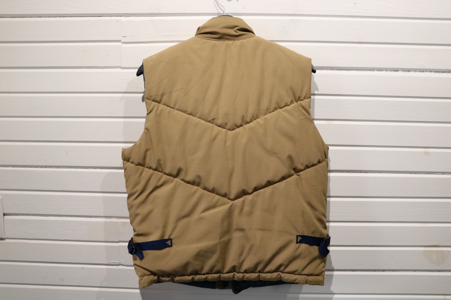 Classic vintage Cannondale tan puffer vest featuring quilted construction and blue detailing.