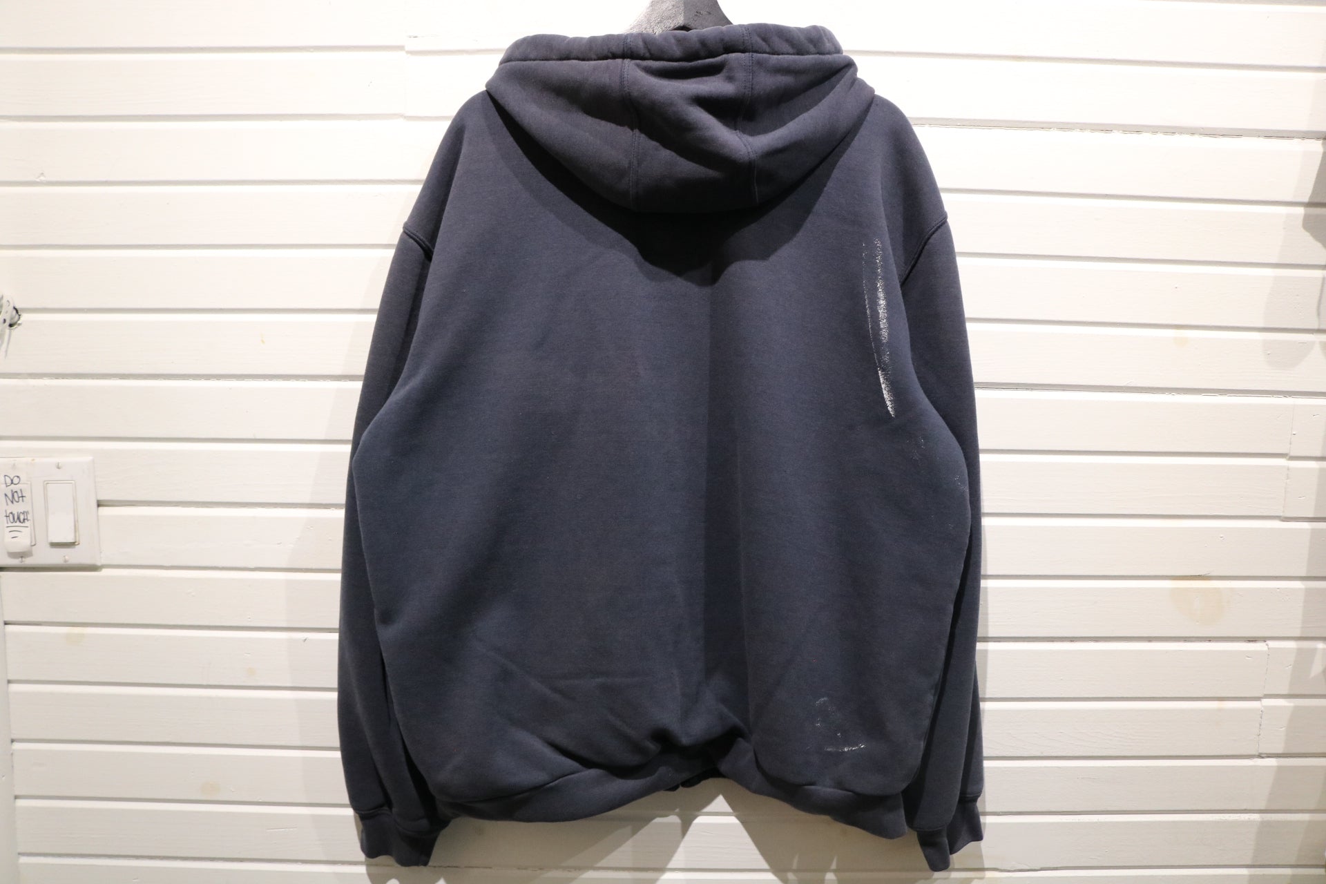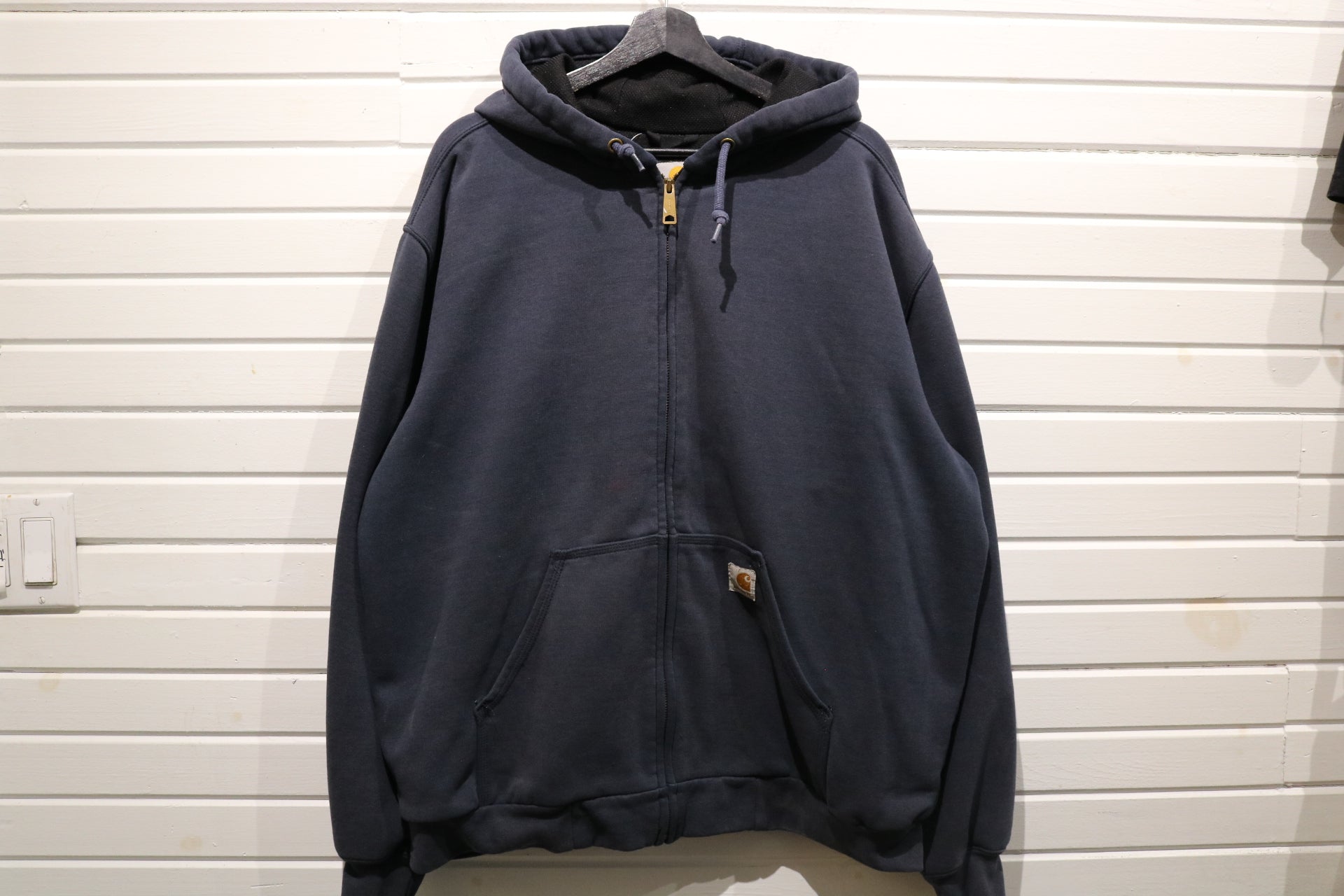 Vintage Carhartt navy blue hooded zip-up sweatshirt with classic brass zipper and front pouch pocket