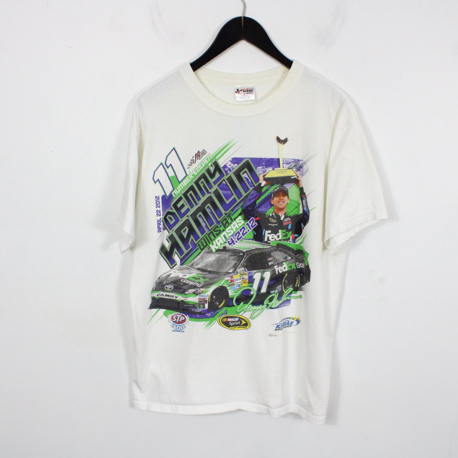 Chase-Authentics NASCAR T-Shirt | Vintage 2012 Denny Hamlin Kansas Speedway Racing Graphic Tee | FedEx Car Motorsport Collectible