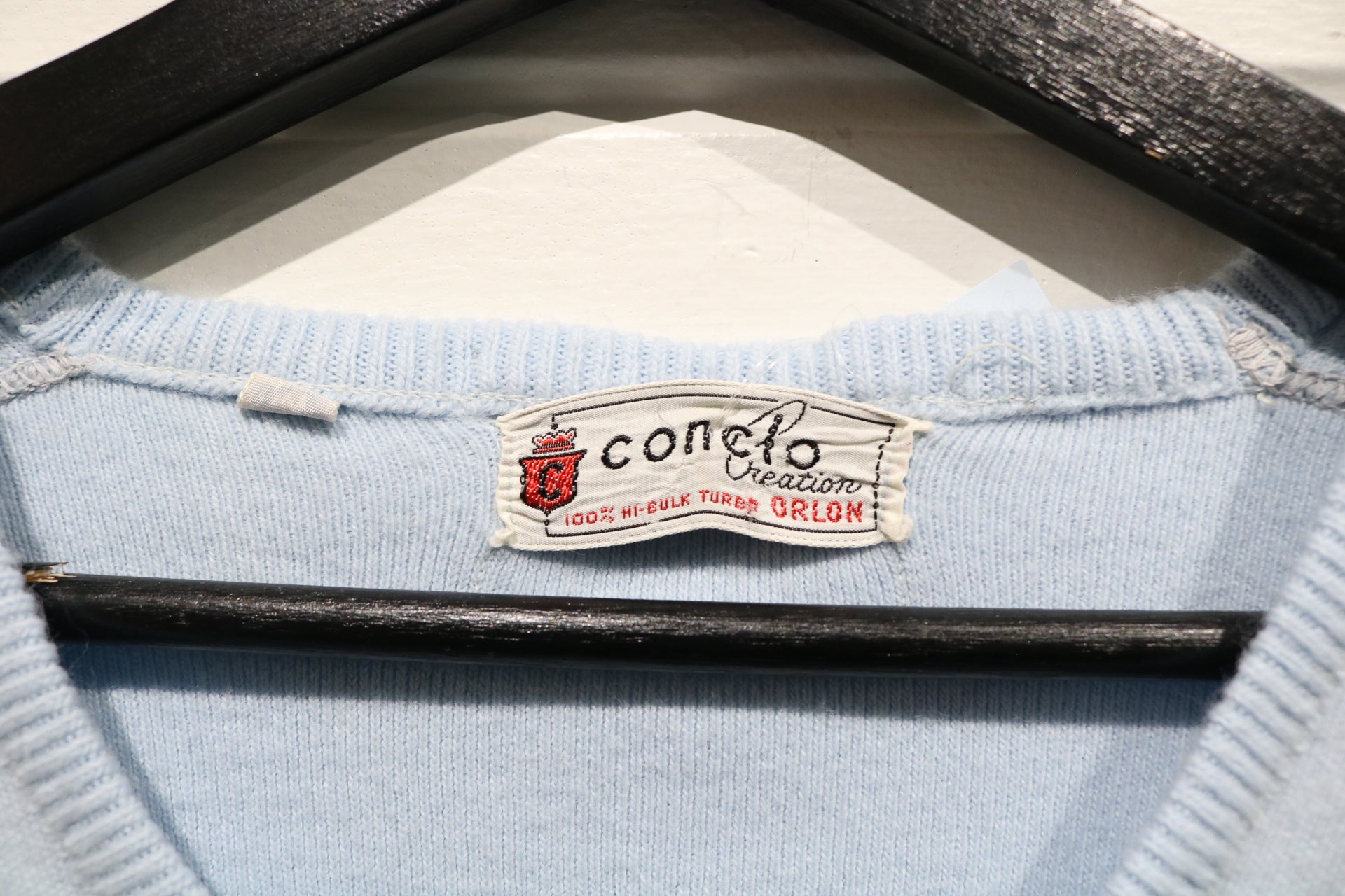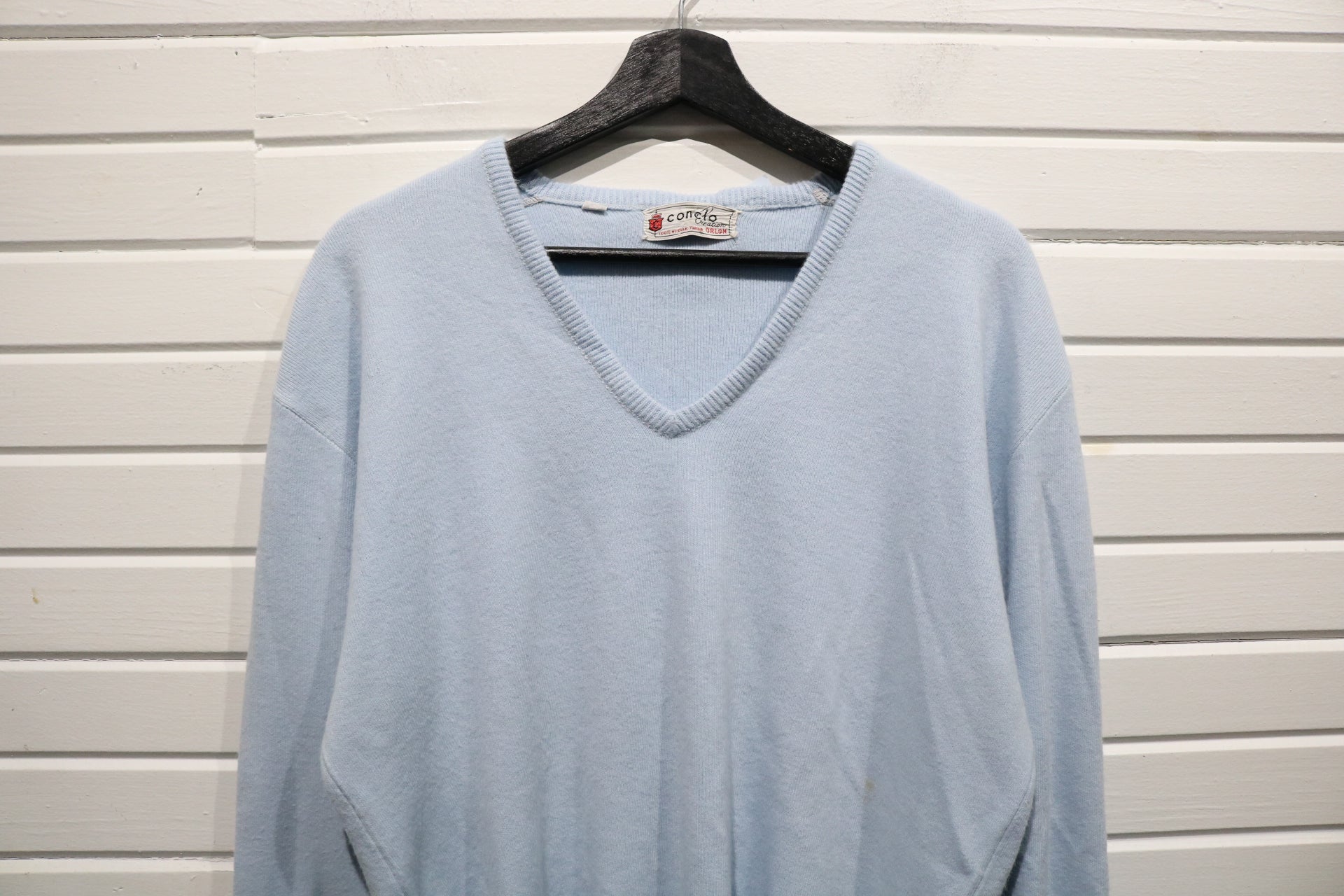 Vintage Concelo-Kreation V-neck sweater in light blue featuring a timeless knit style and ribbed cuffs.