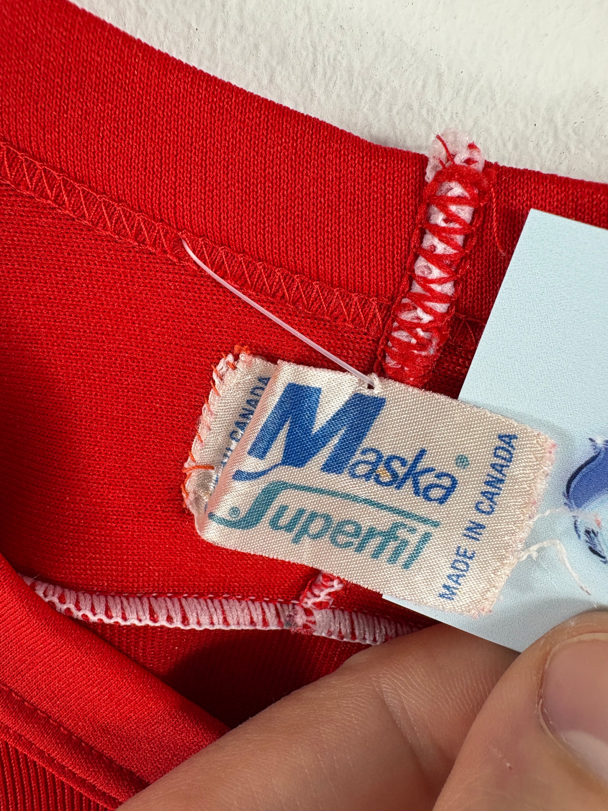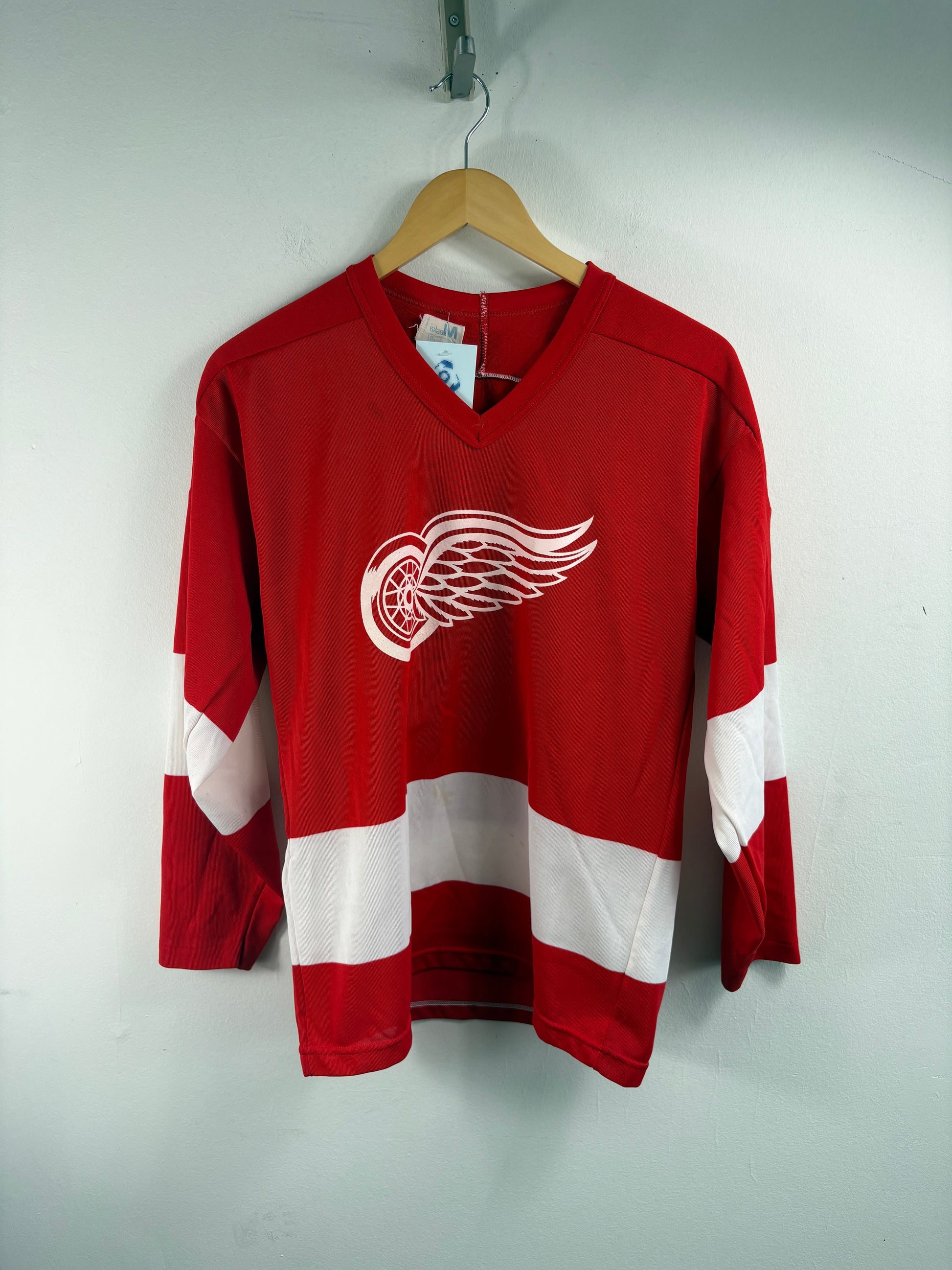 Vintage Detroit-Red-Wings Maska Superfil hockey jersey in classic red with white stripes and winged wheel logo.