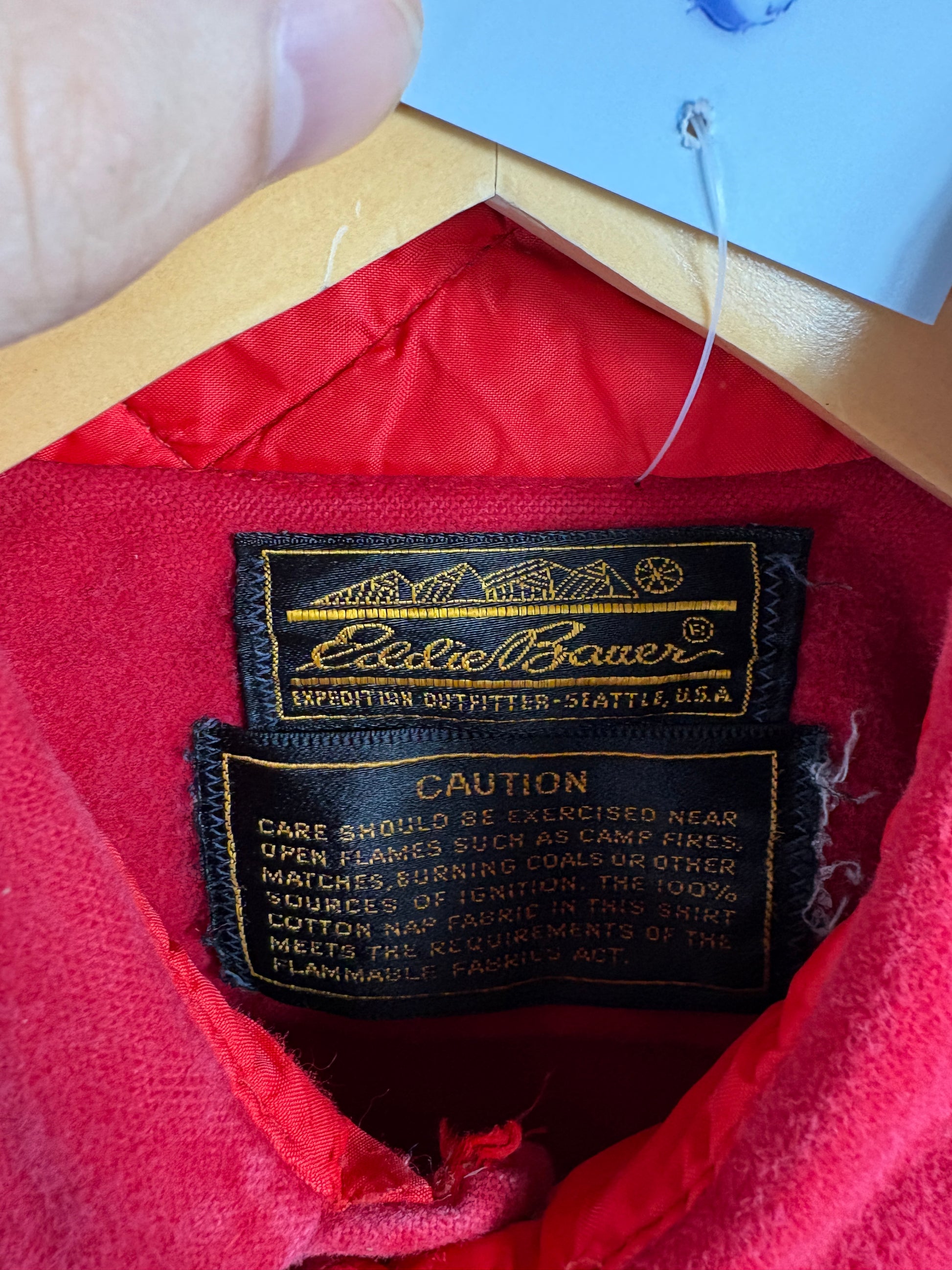 Vintage Eddie Bauer red flannel shirt featuring a classic button-up front and dual chest pockets.