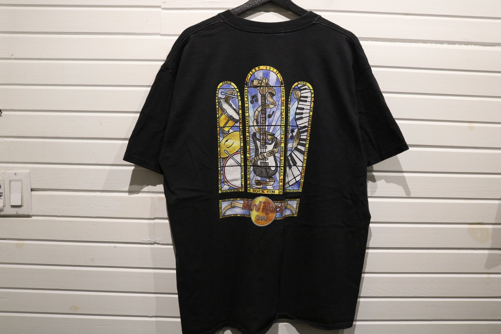 Vintage Hard-Rock Cafe Washington-DC T-Shirt with vibrant stained glass inspired graphics on back and small chest logo