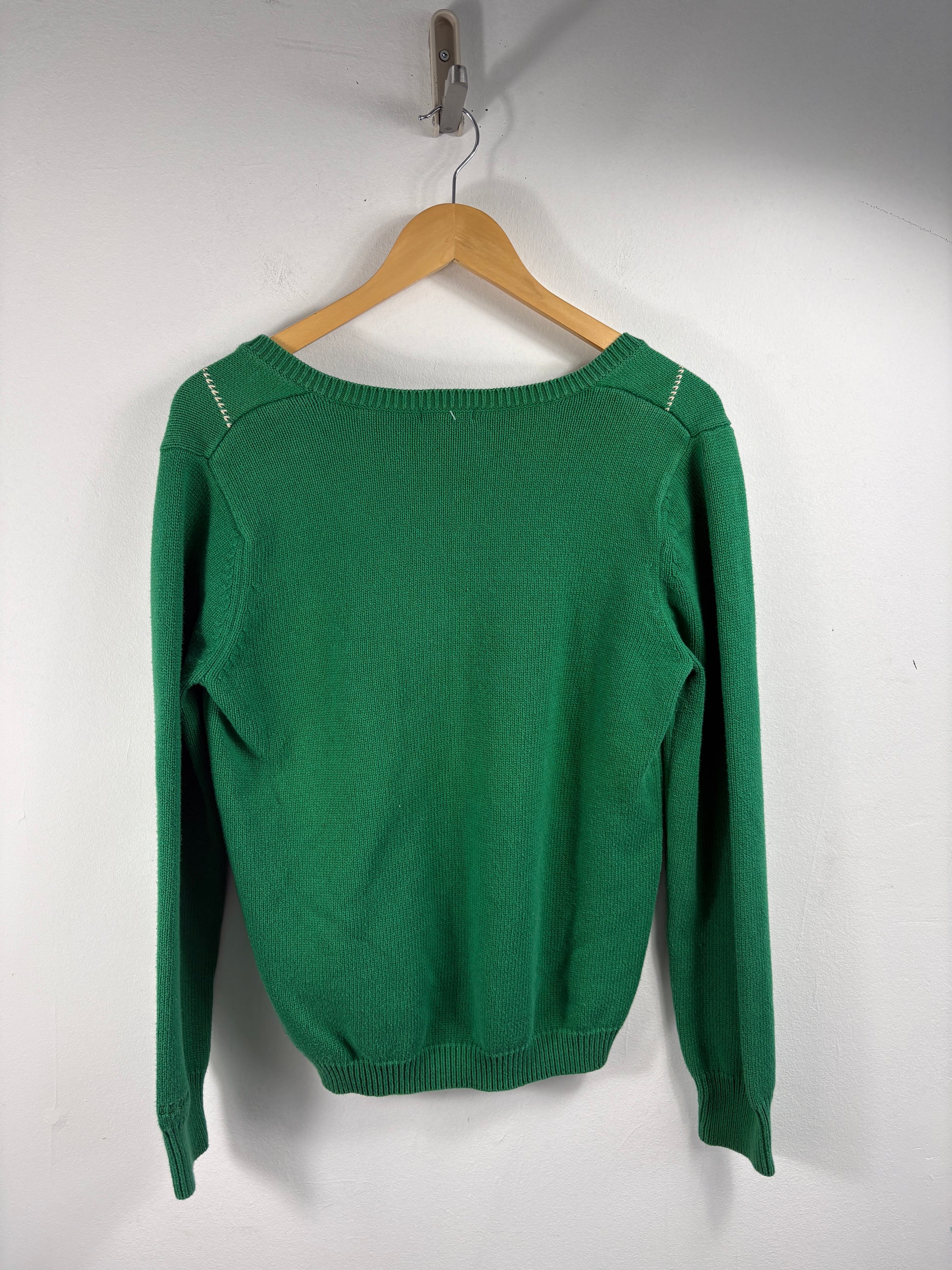 Green argyle knit pullover with classic v-neck and preppy diamond pattern design.