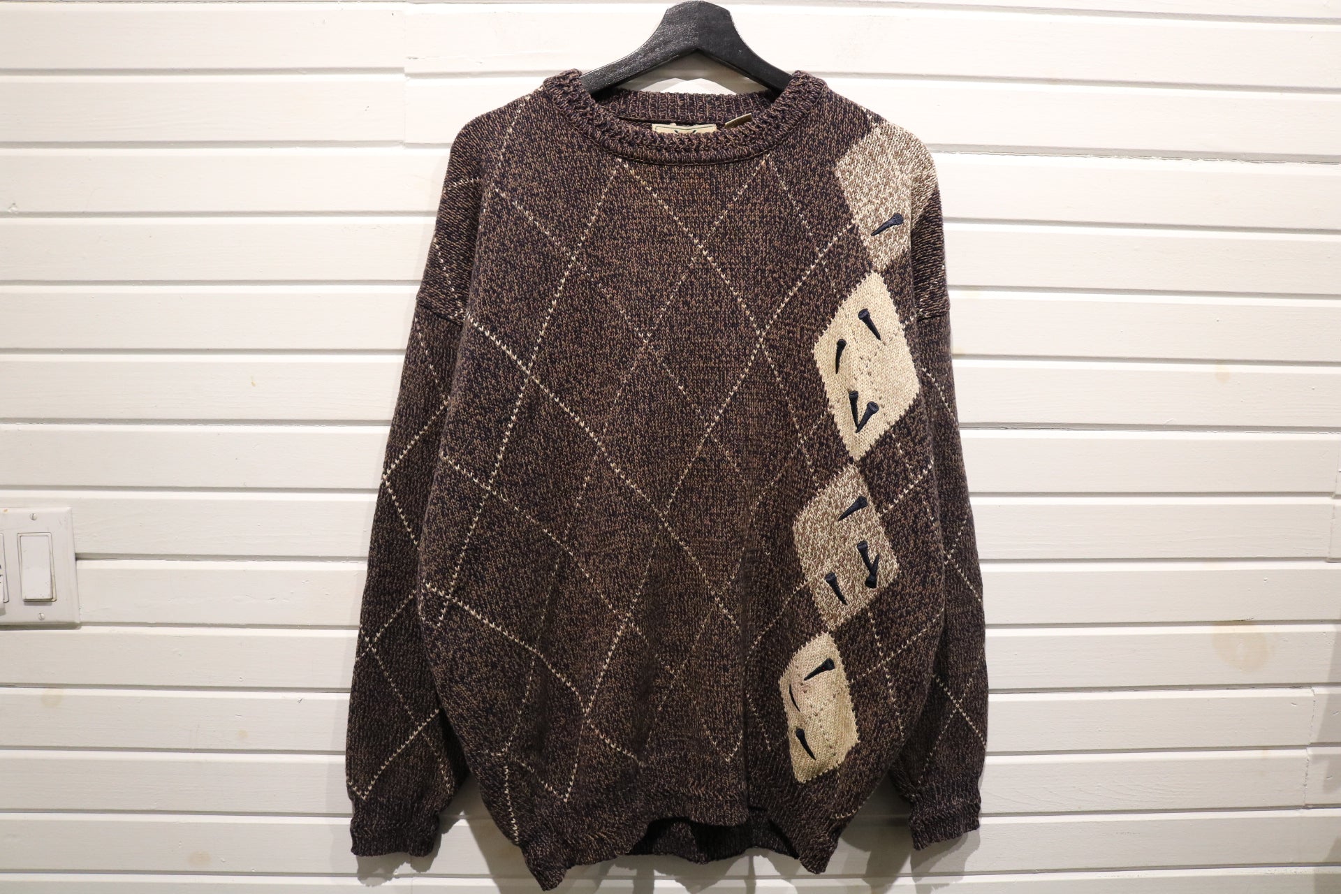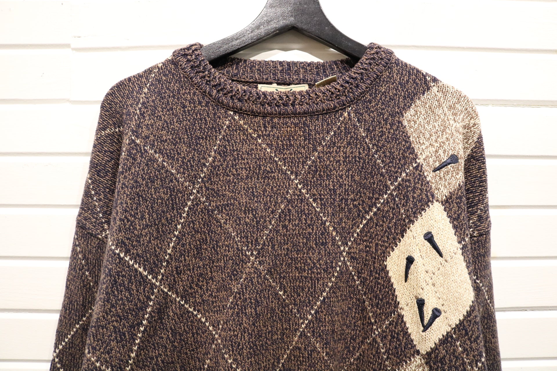 Classic Izod knit sweater with a vintage argyle pattern and embroidered details.