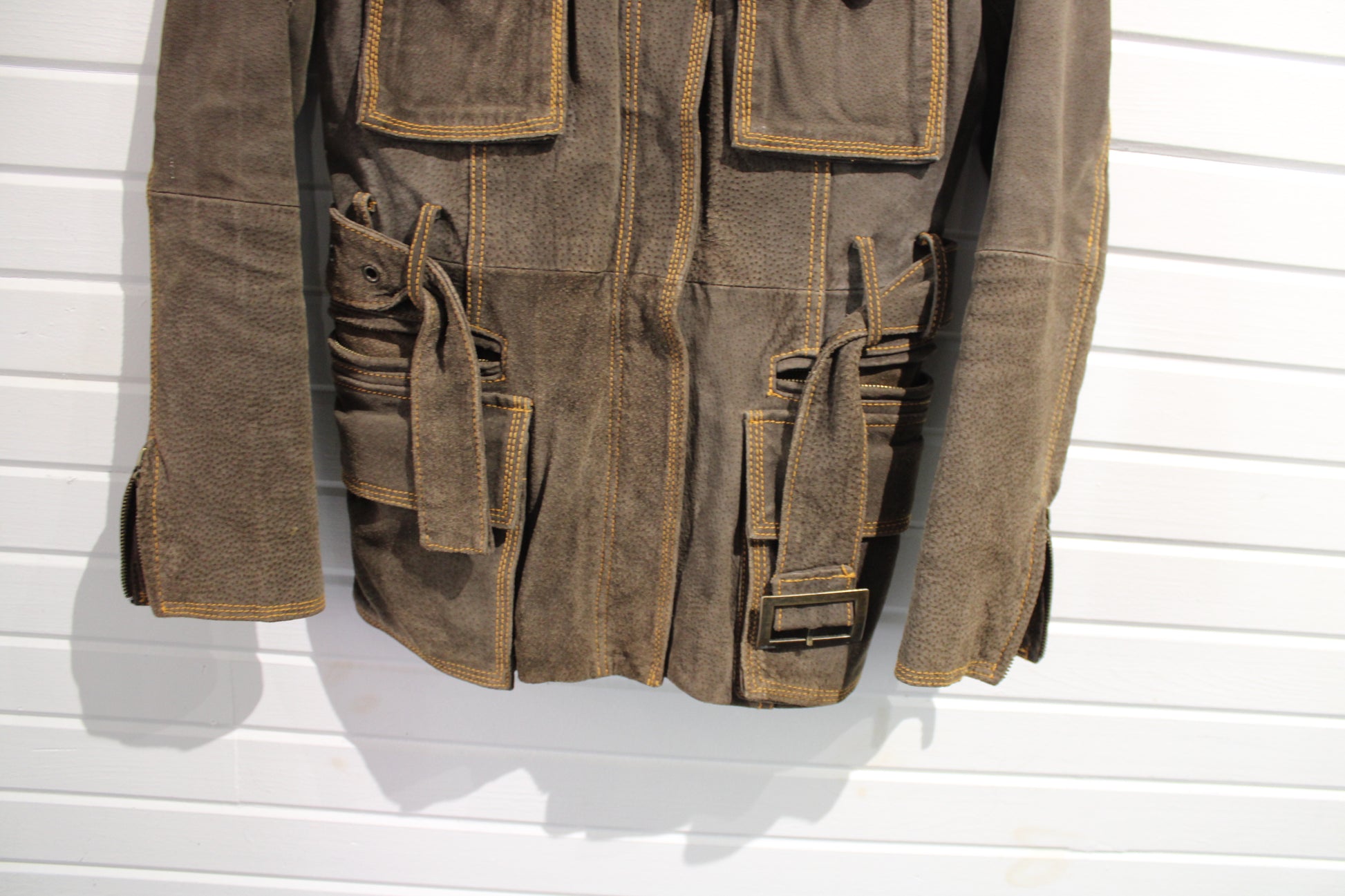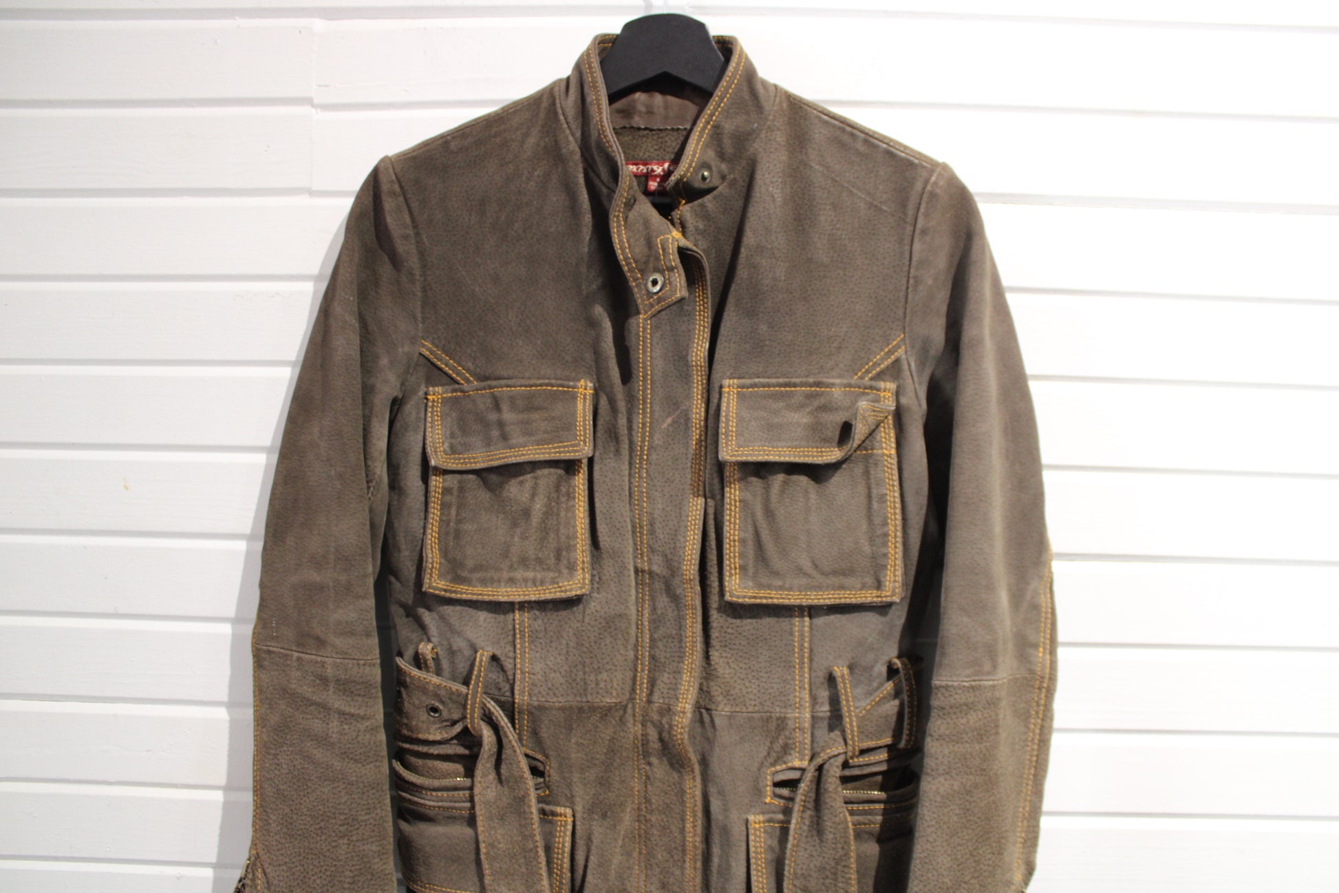 Vintage belted brown field jacket with utility pockets and zip cuffs, featuring heavy contrast stitching.