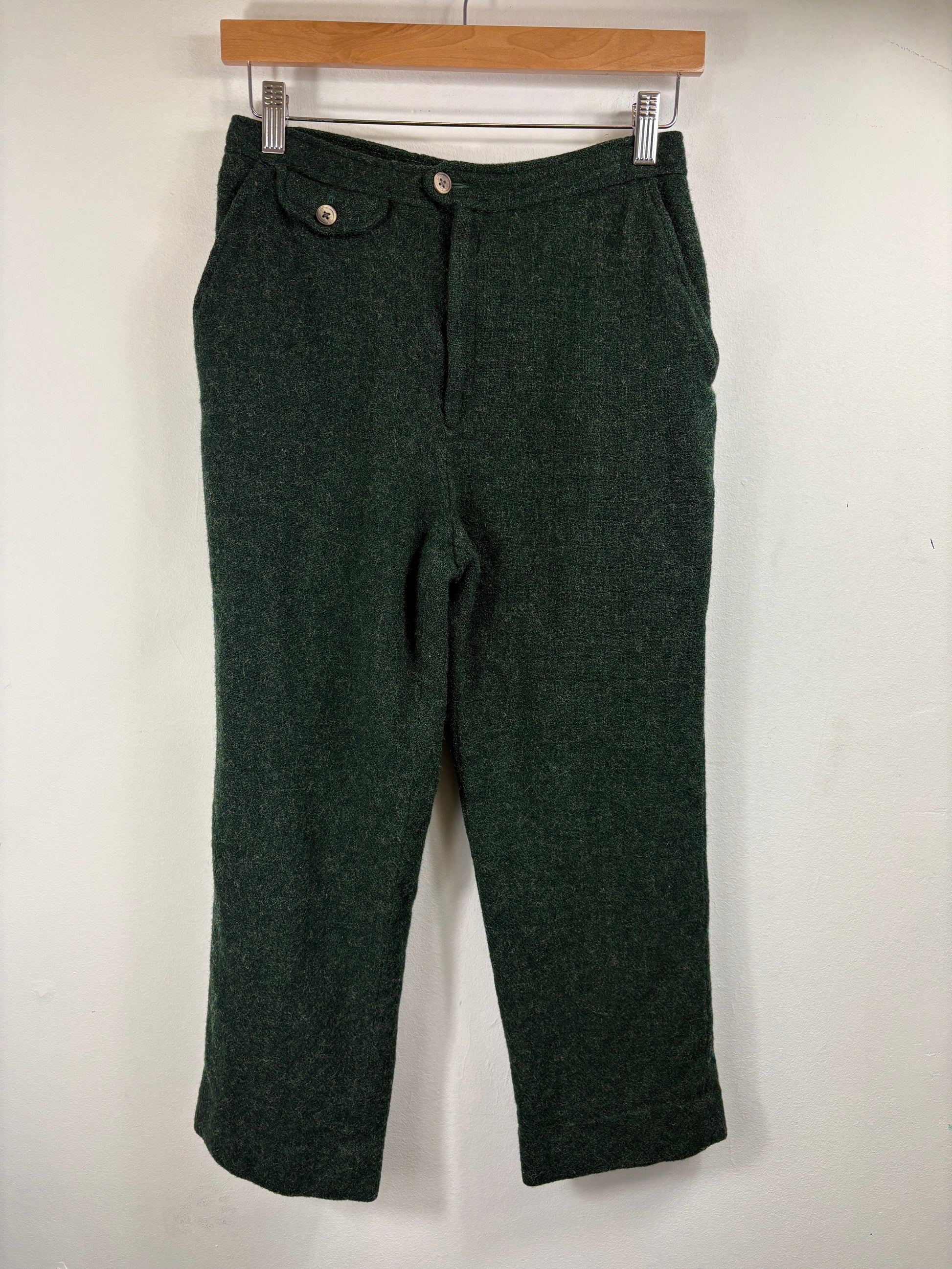 Vintage JG-Hook wool trousers in a heathered green shade with straight-leg silhouette and textured finish.