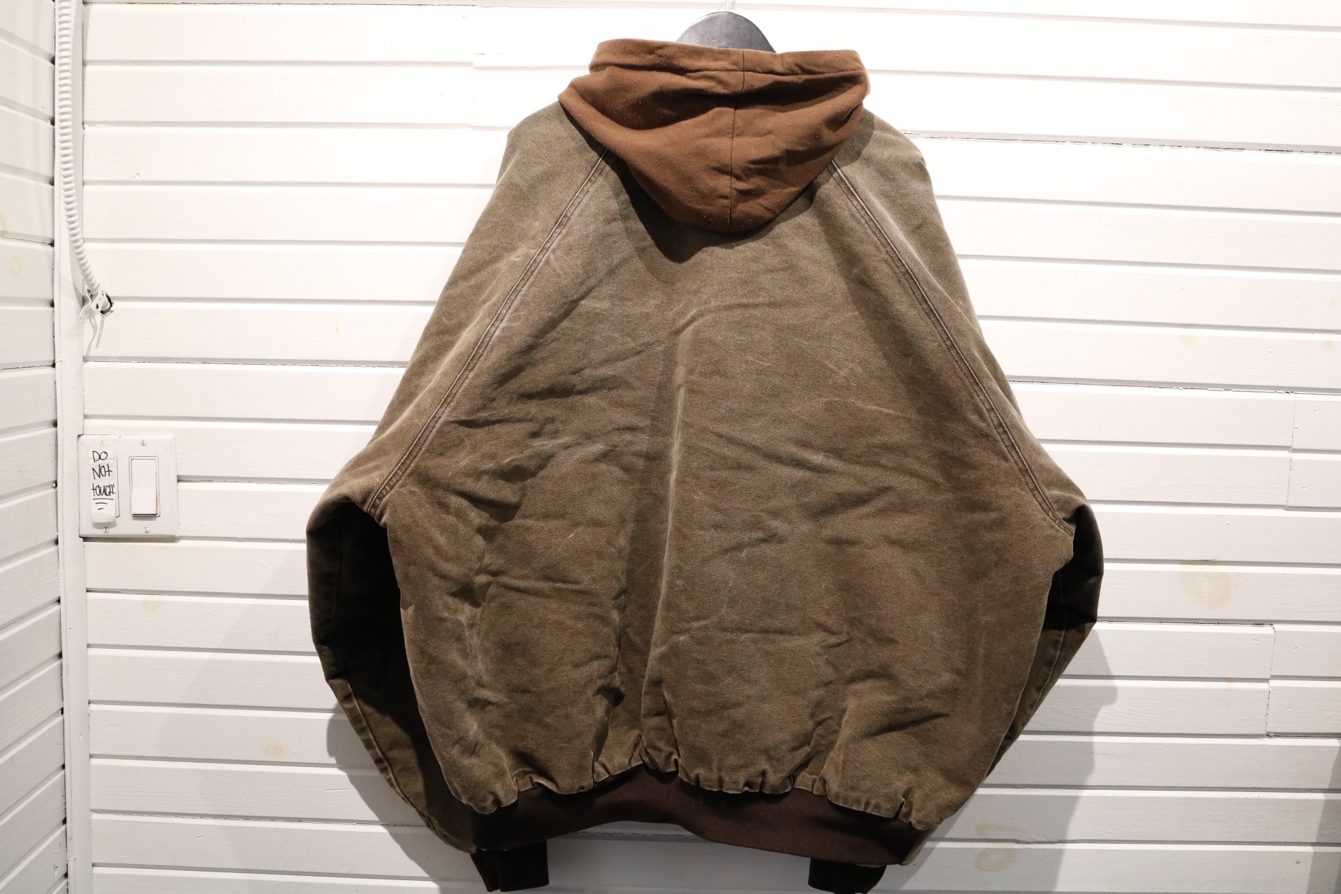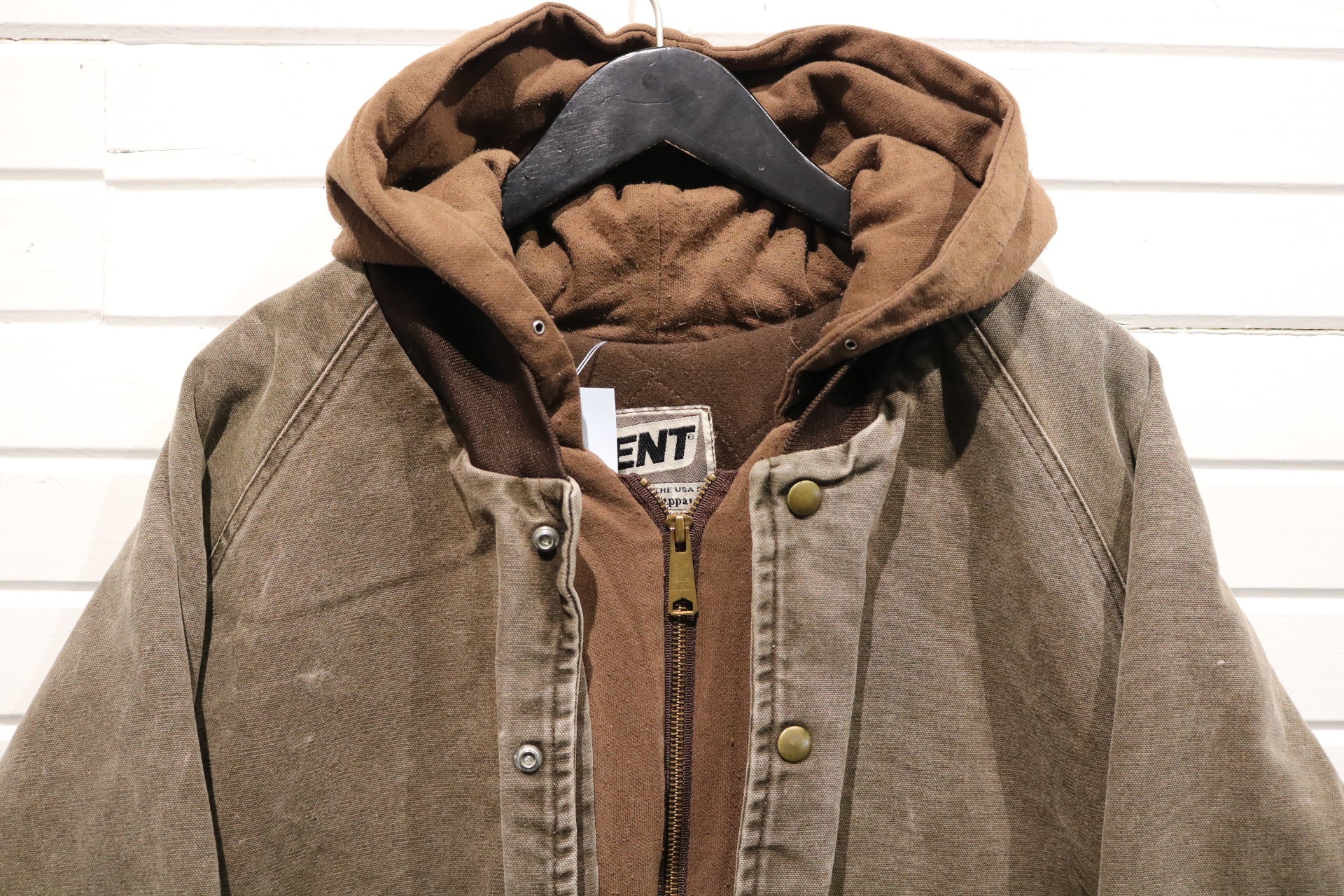 Heavy weight canvas jacket with hood and brass hardware, featuring double front pockets and rugged brown outer shell.