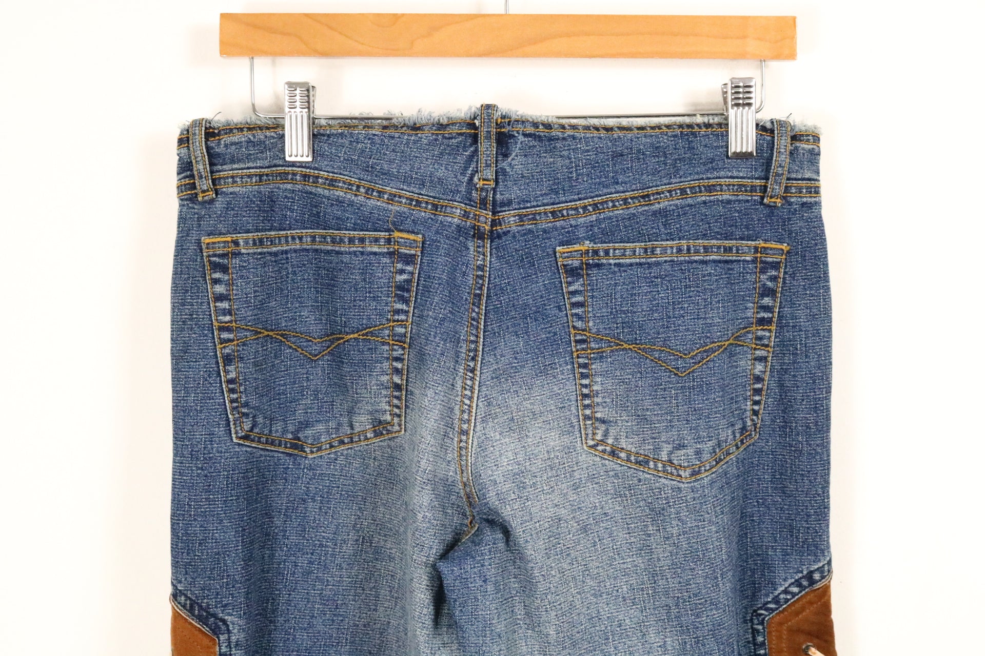 FLAWS: Distressing on hems and waistband, vintage fading, brown suede panel wear - Please See Pictures For Any Wear/Tear - If There Are No Pictures Of Specific Flaws, The Item Is FLAWLESS