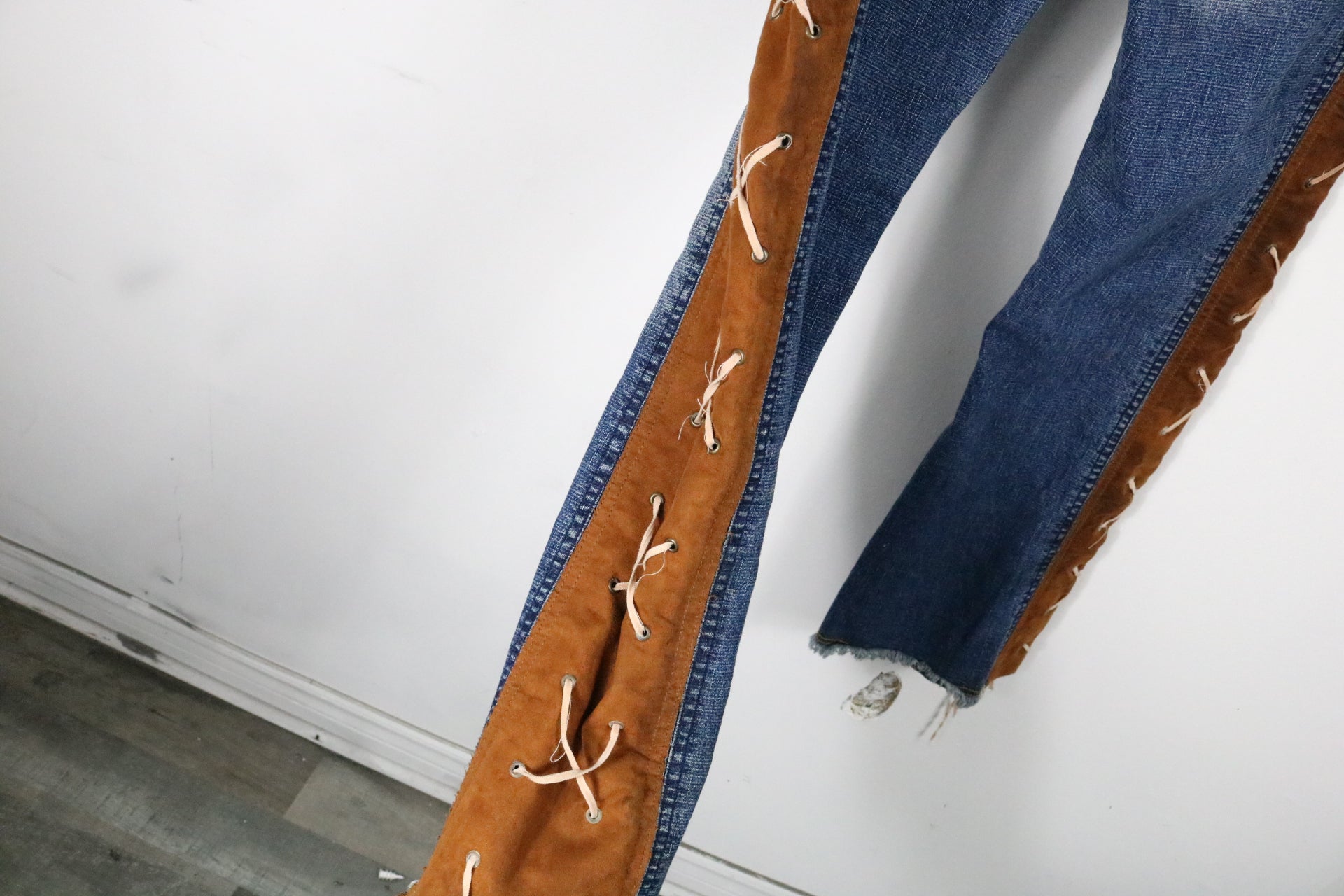 Lazerjeans Denim Pants | Vintage Western Lace-Up Jeans with Brown Suede Panels | Distressed Blue Cowboy Style