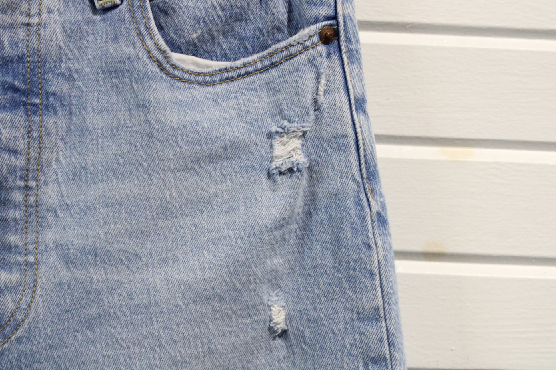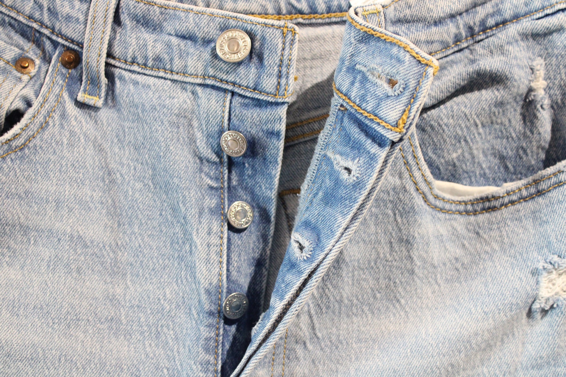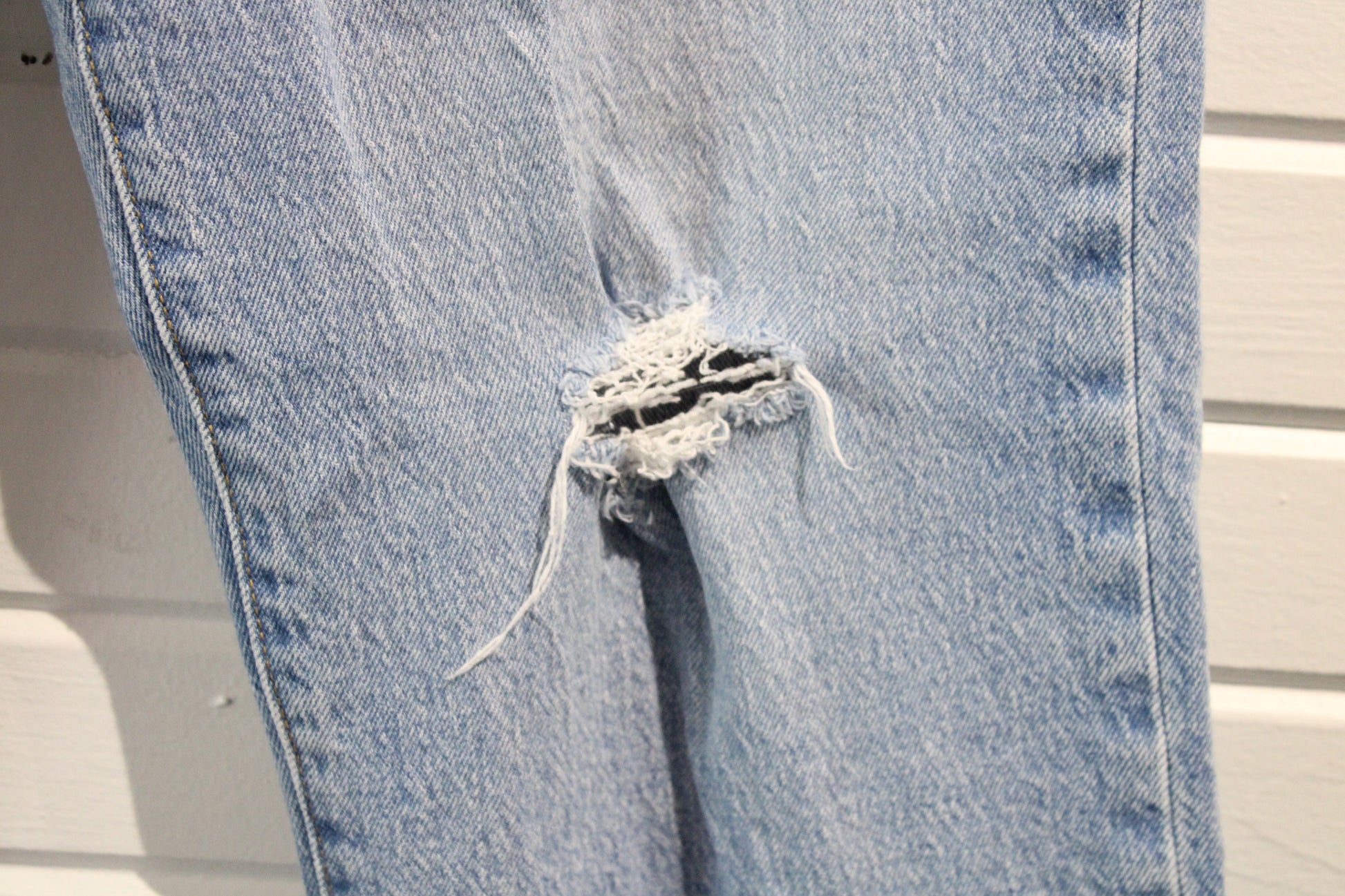 FLAWS: Heavy distressing with thigh tear and frayed spots - Please See Pictures For Any Wear/Tear - If There Are No Pictures Of Specific Flaws, The Item Is FLAWLESS
