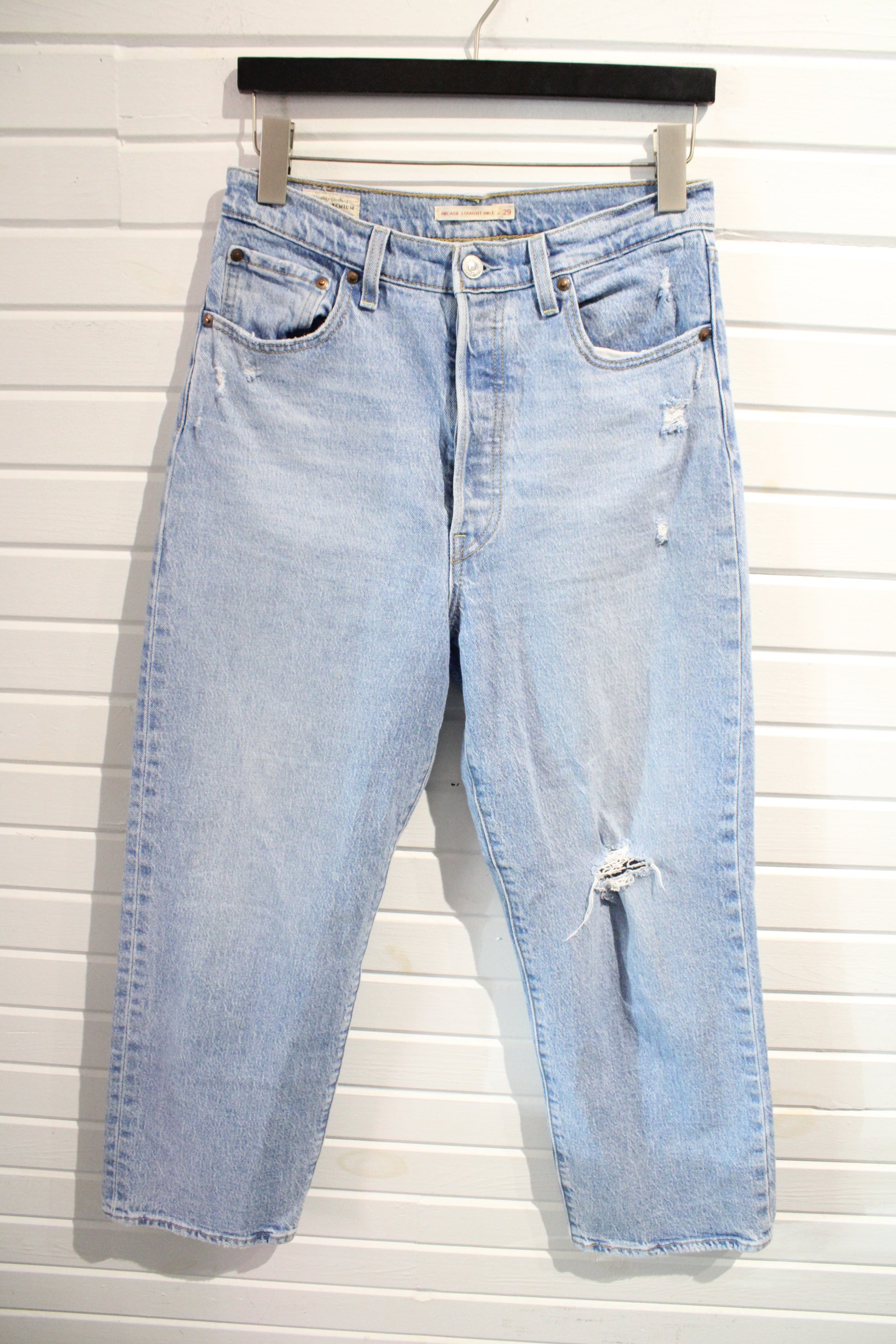 Vintage Light Wash Levi's Ribcage Straight Ankle Jeans with distressed details and classic button-fly.