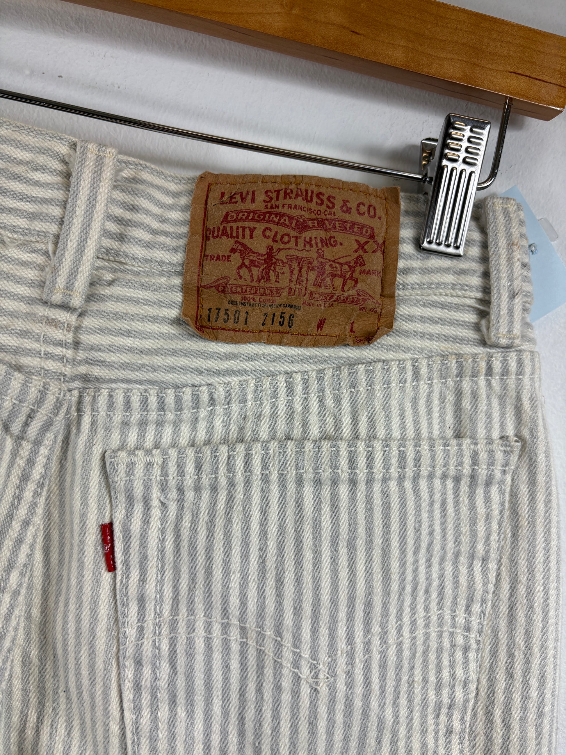 Vintage Levi's striped jeans featuring an off-white and gray pinstripe pattern, classic five-pocket styling, and Levi's patch on back.
