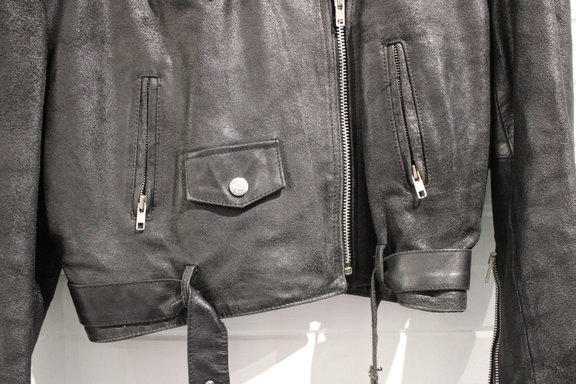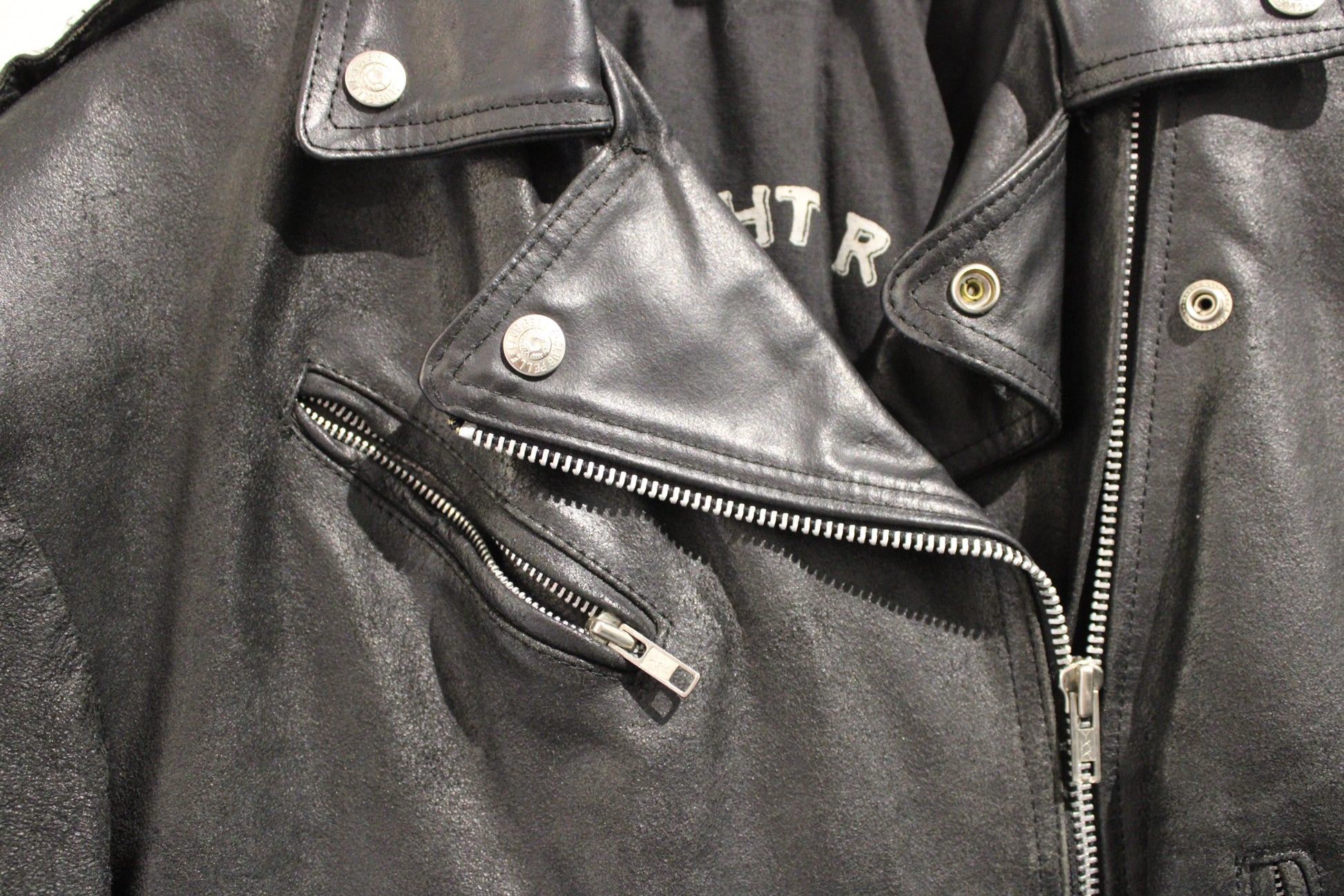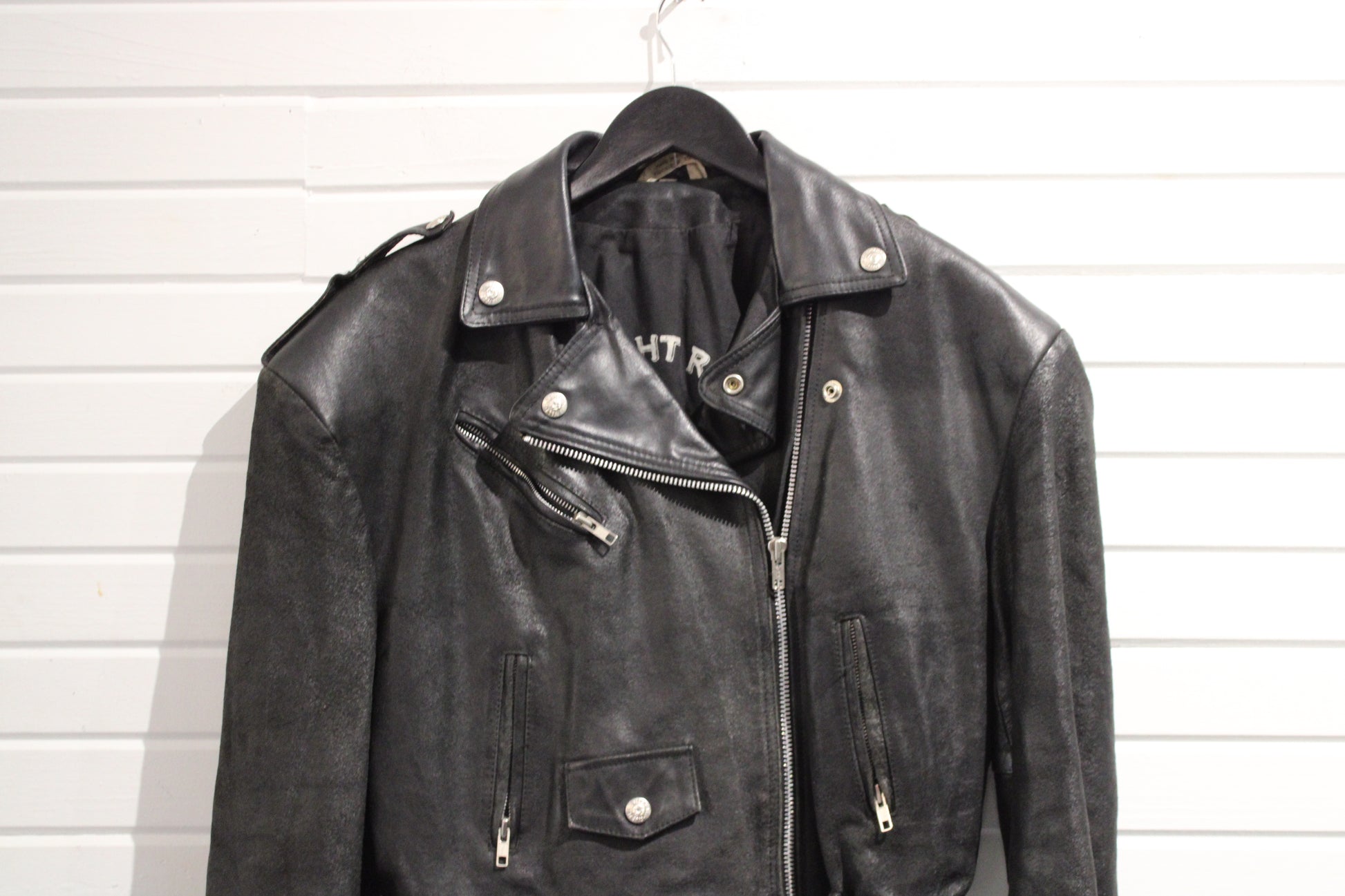 Vintage 1980s black leather biker jacket with 'Midnight Ride' graphic lining and classic details.