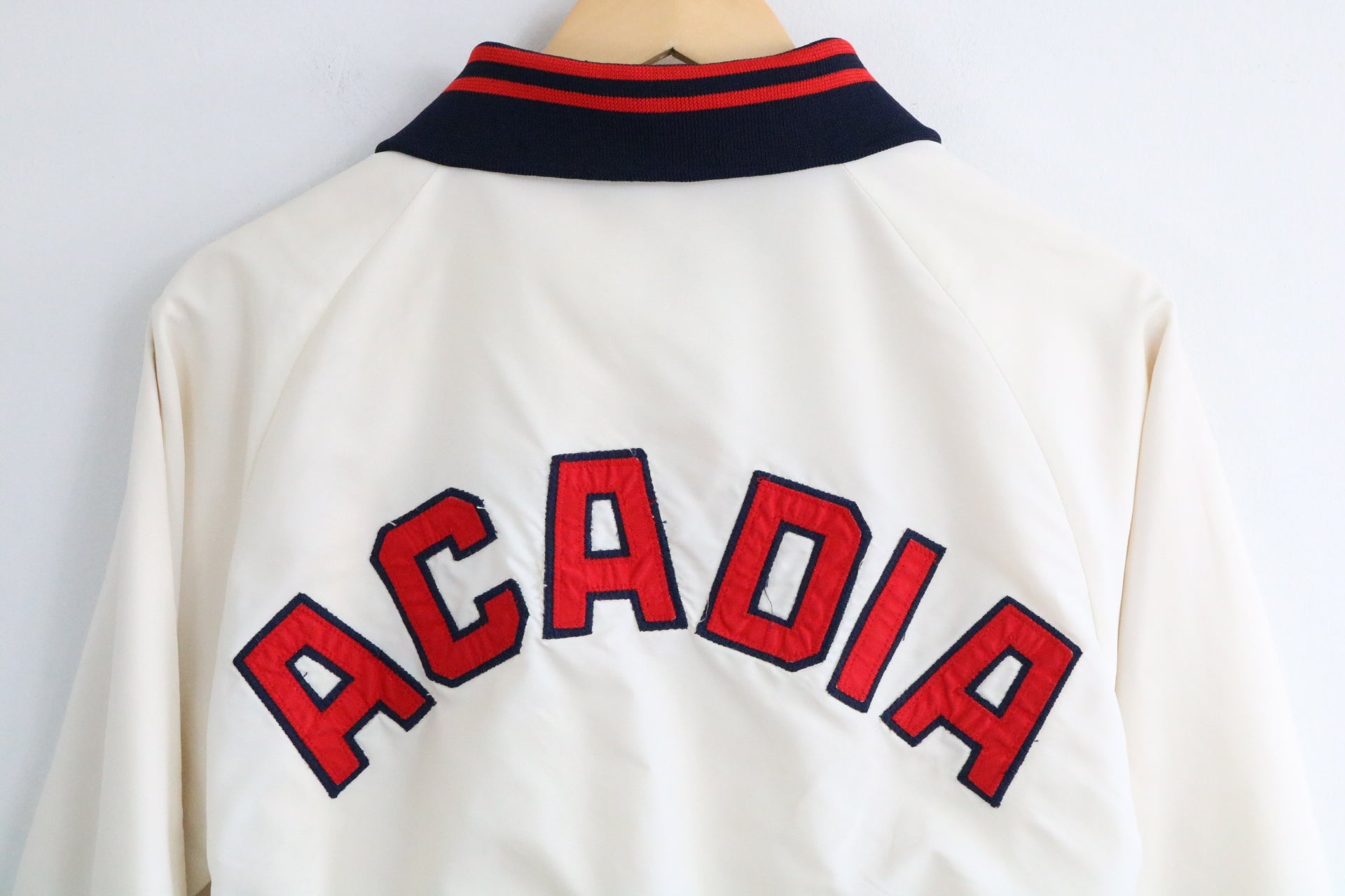 Classic varsity bomber jacket with collegiate Acadia lettering and striped ribbed trim.