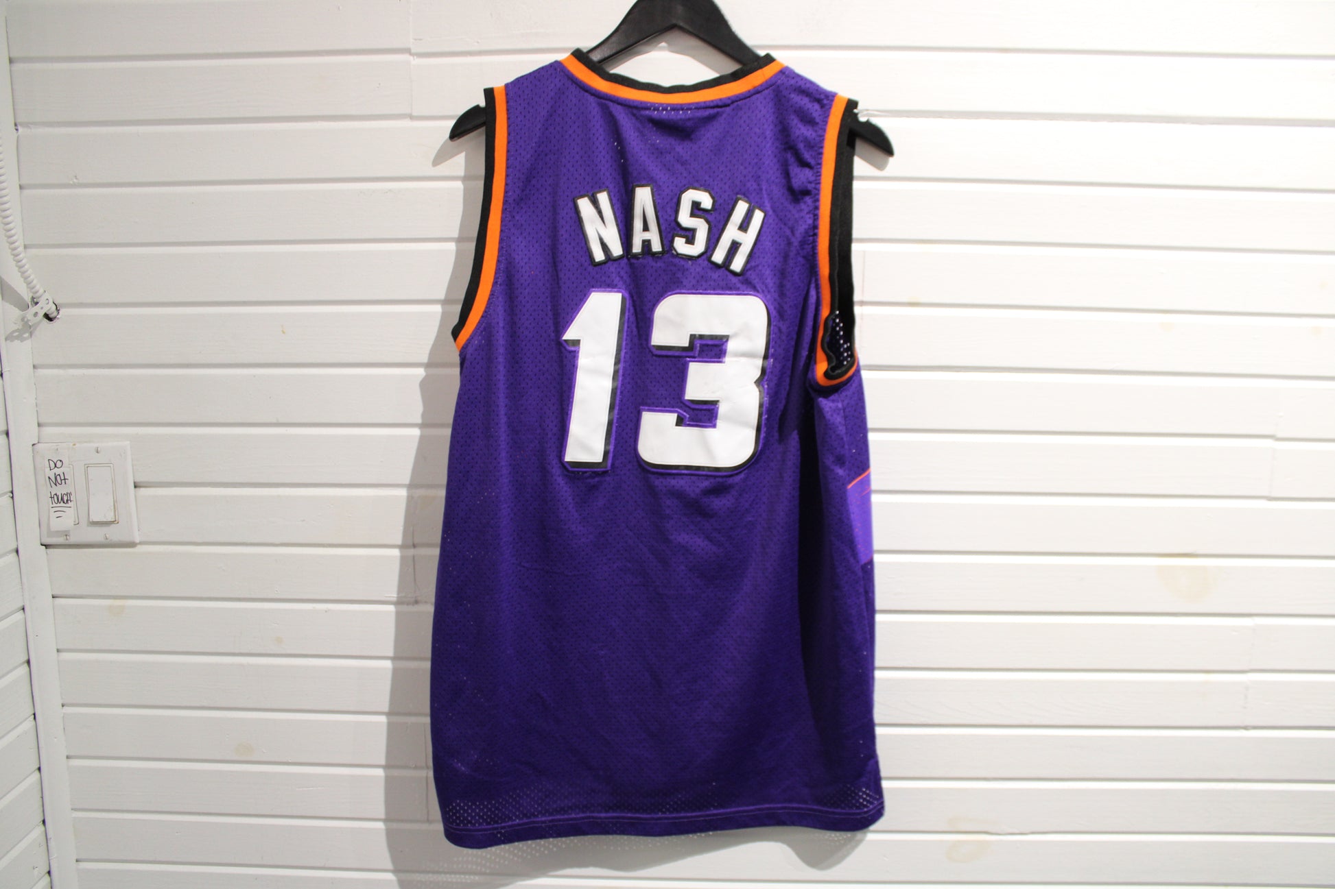 Vintage Phoenix Suns Steve Nash Adidas Basketball Jersey in bold purple mesh with iconic team graphics and player name/number.
