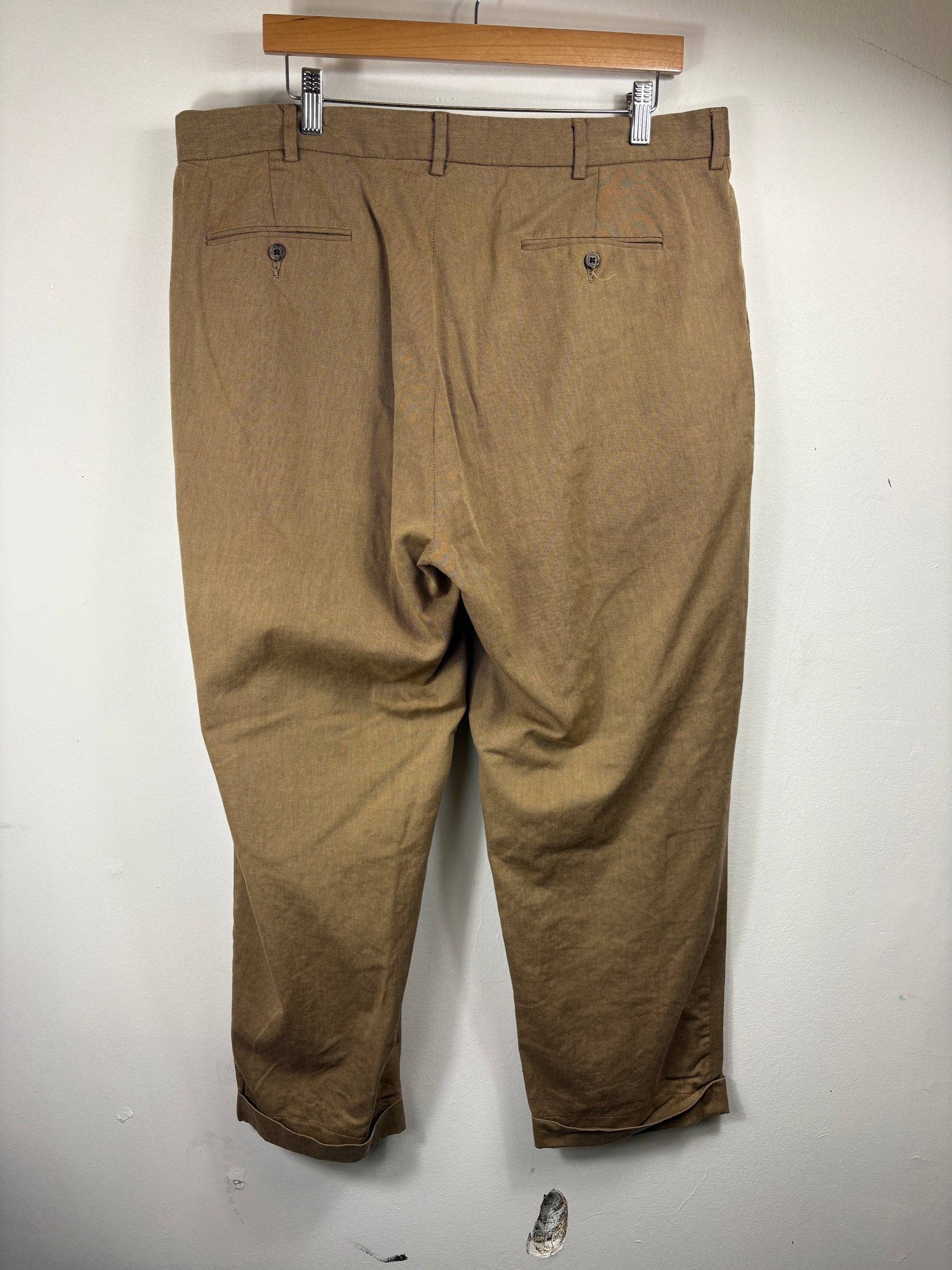 Vintage Polo-by-Ralph-Lauren trousers in a classic tan shade with a pleated front and buttoned back pockets.