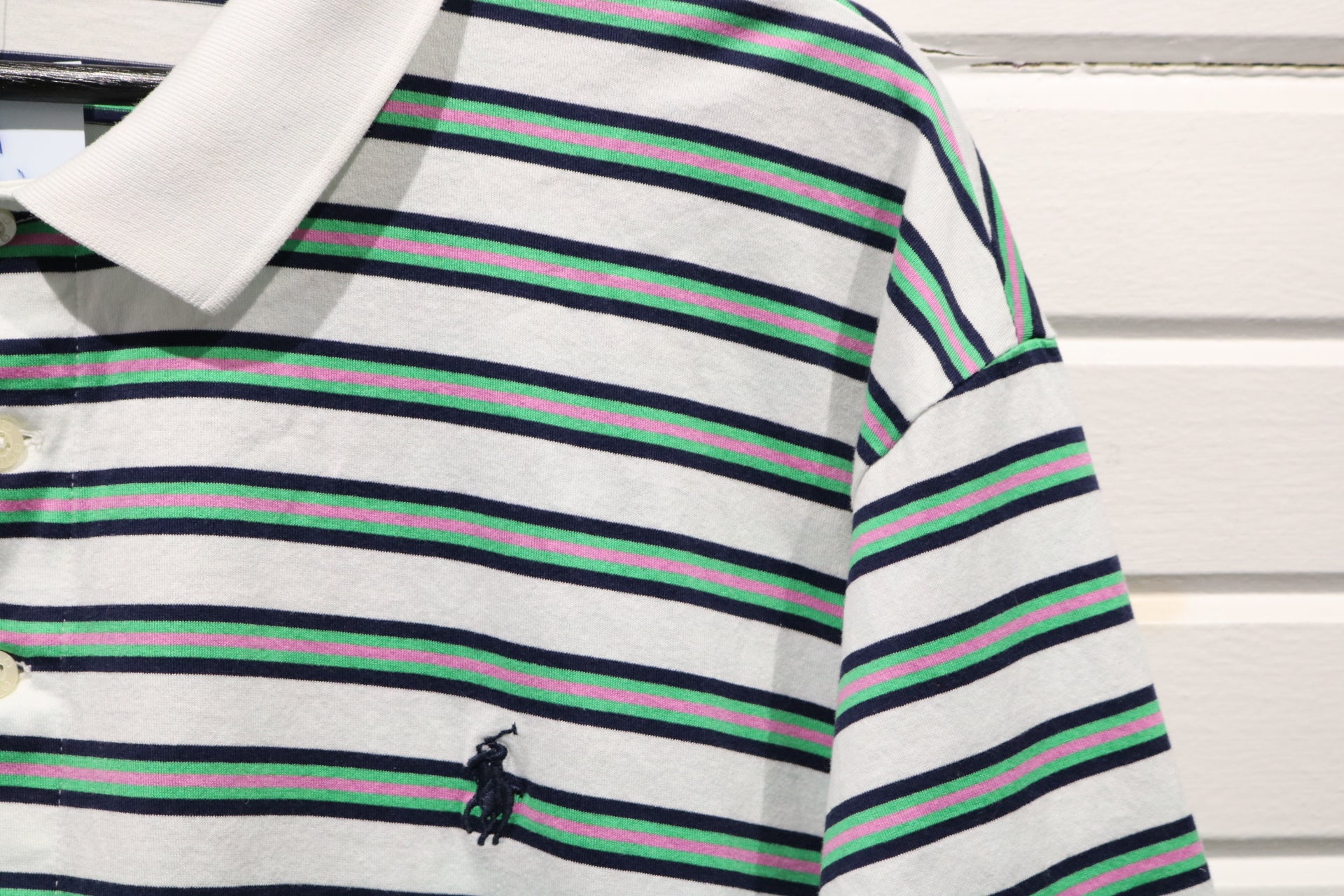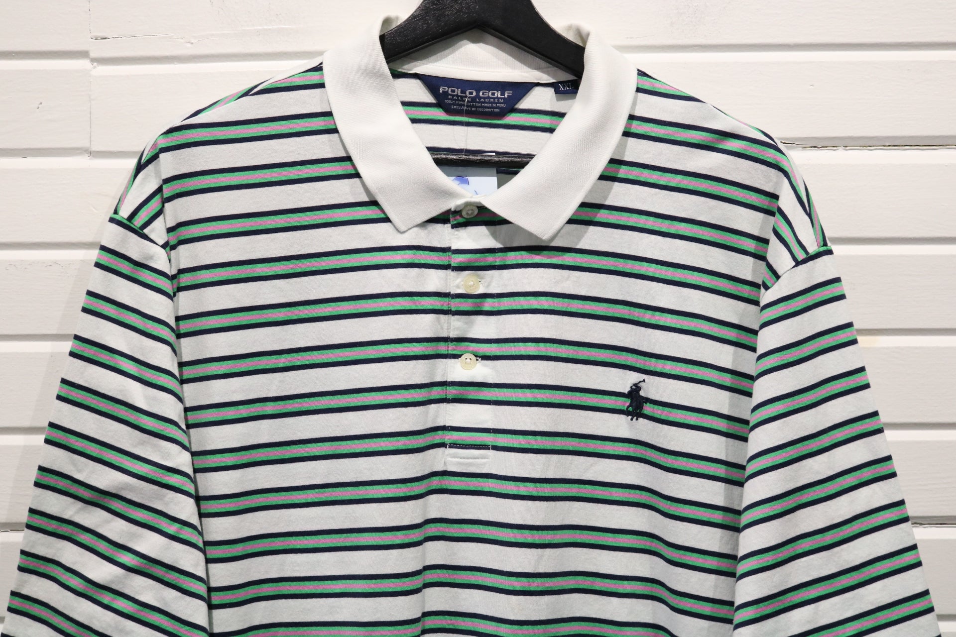 Vintage Polo Ralph Lauren Golf Polo Shirt with classic green, navy, and pink stripe pattern and embroidered logo detail.