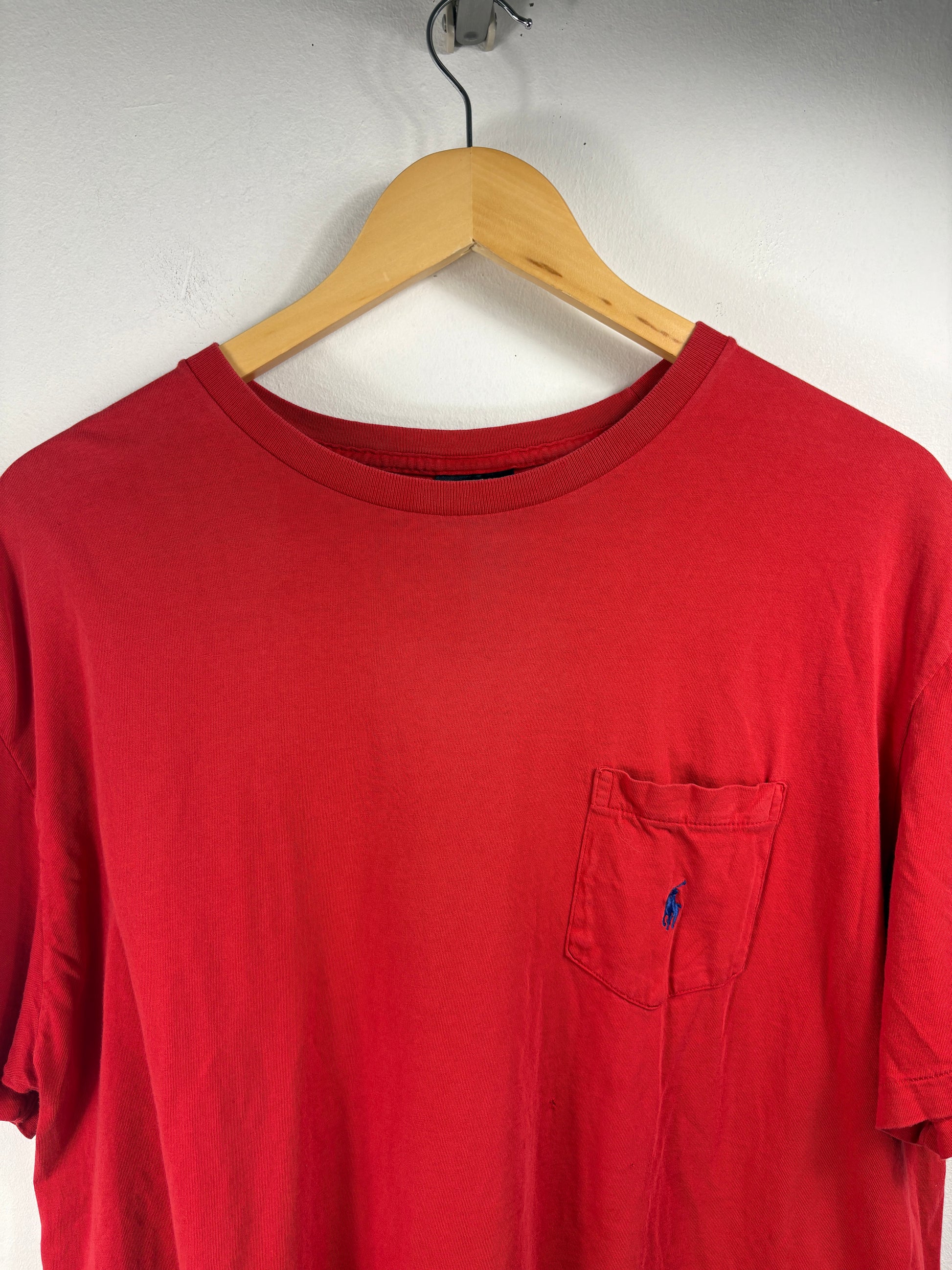 Classic red Polo-Ralph-Lauren short sleeve pocket t-shirt with blue embroidered logo.