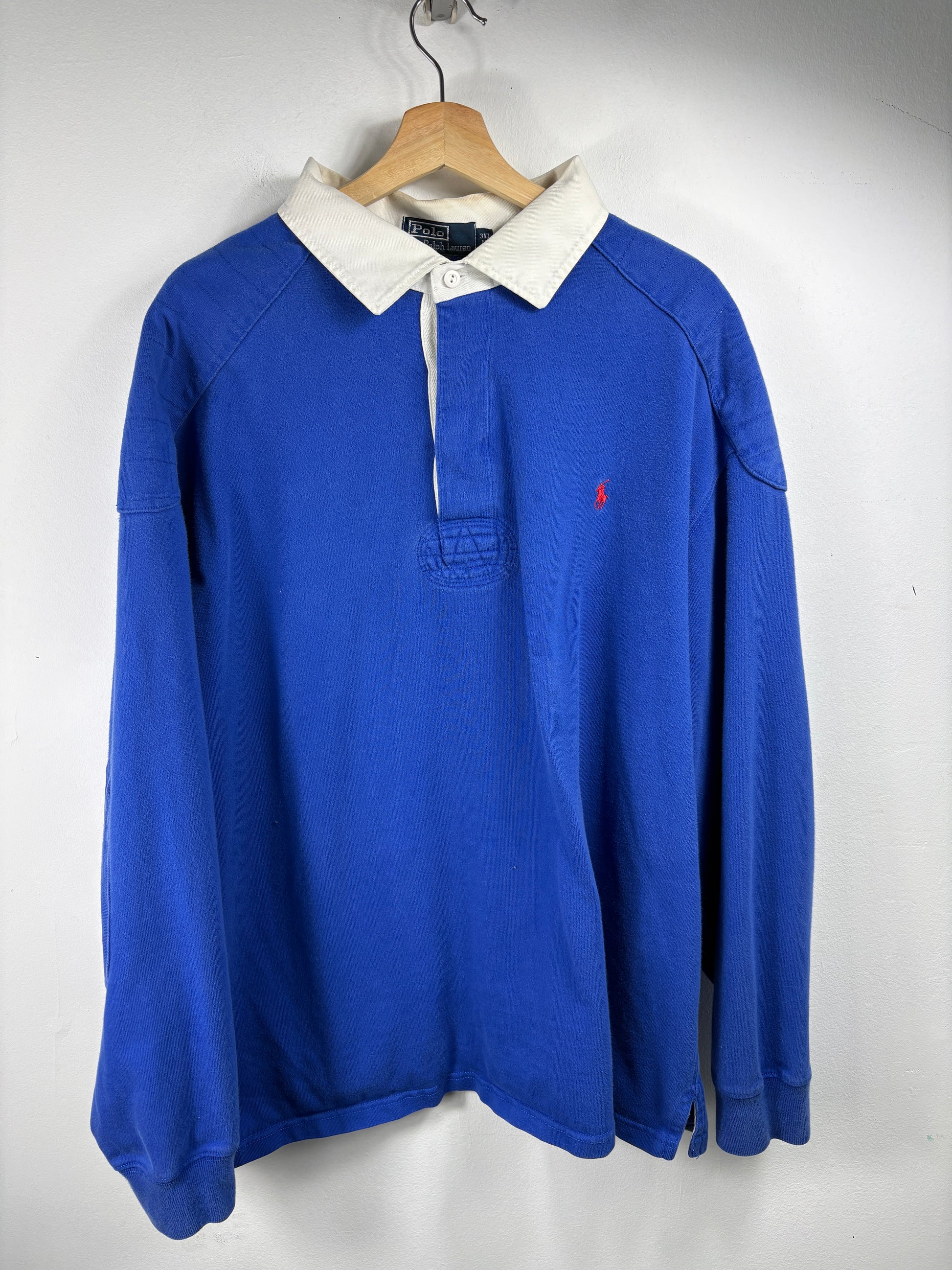 Vintage Polo Ralph Lauren Rugby Shirt in vivid blue with a contrasting white collar and embroidered chest logo