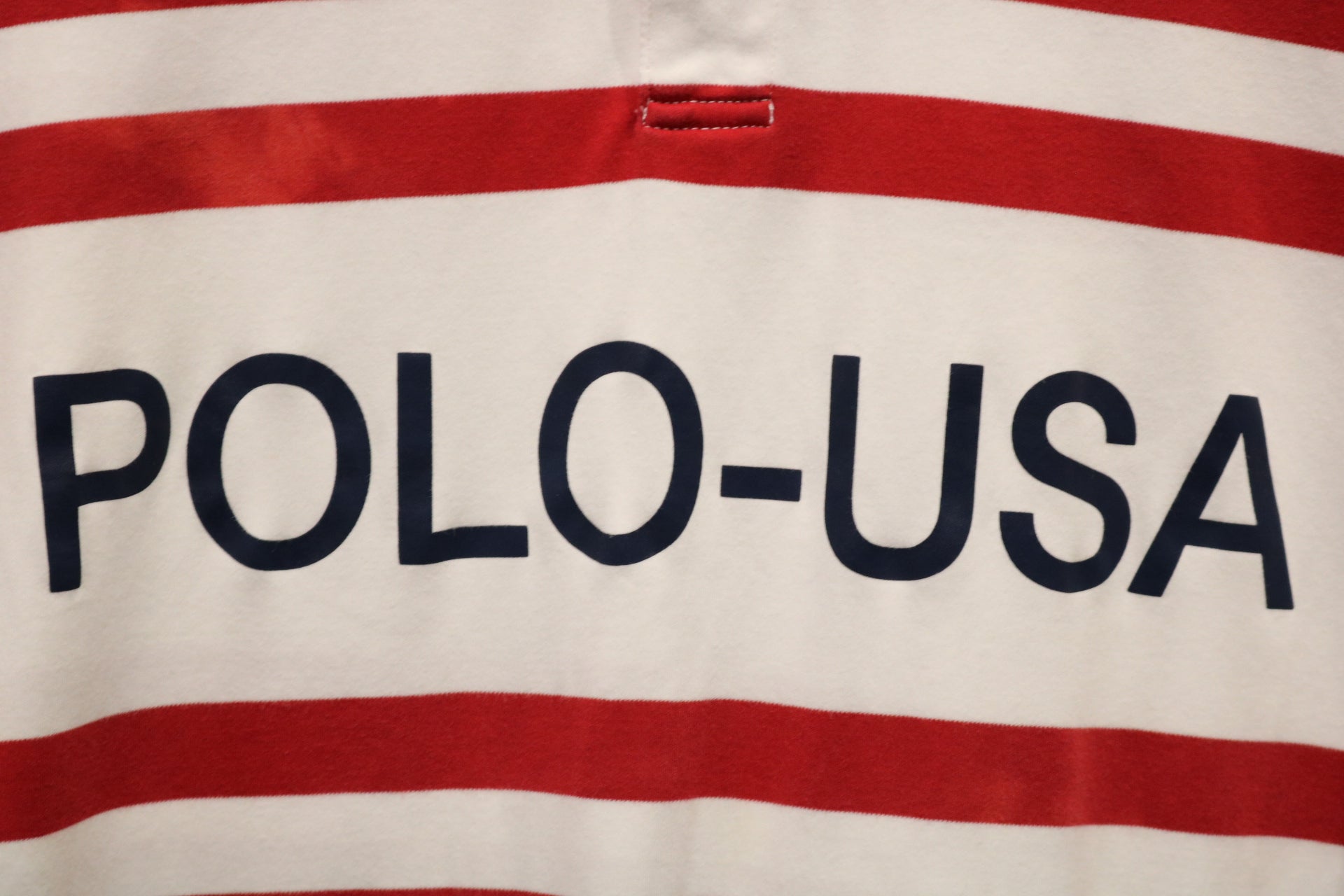 Vintage Polo Ralph-Lauren rugby shirt with bold red stripes and 'POLO-USA' print across the chest.