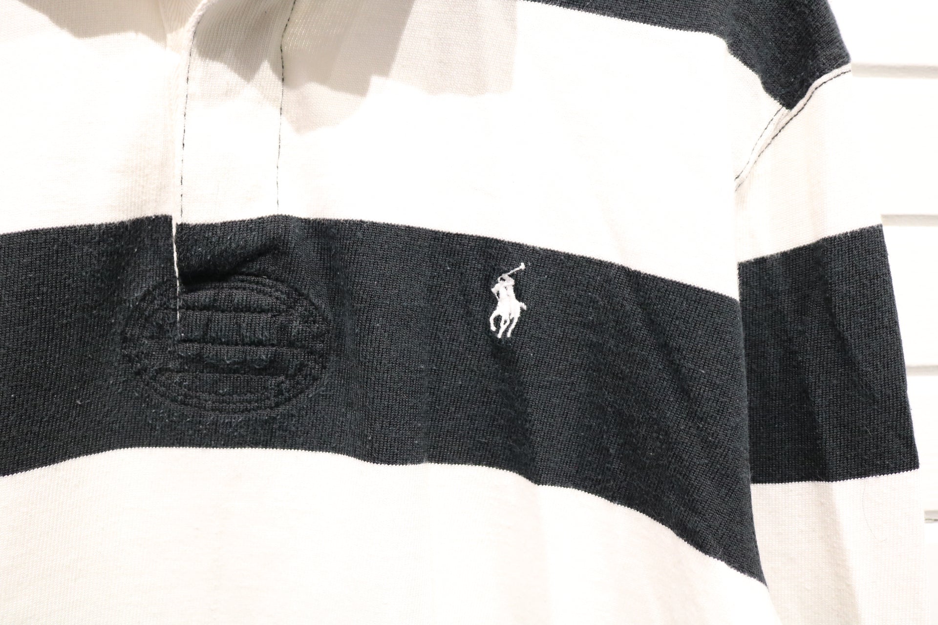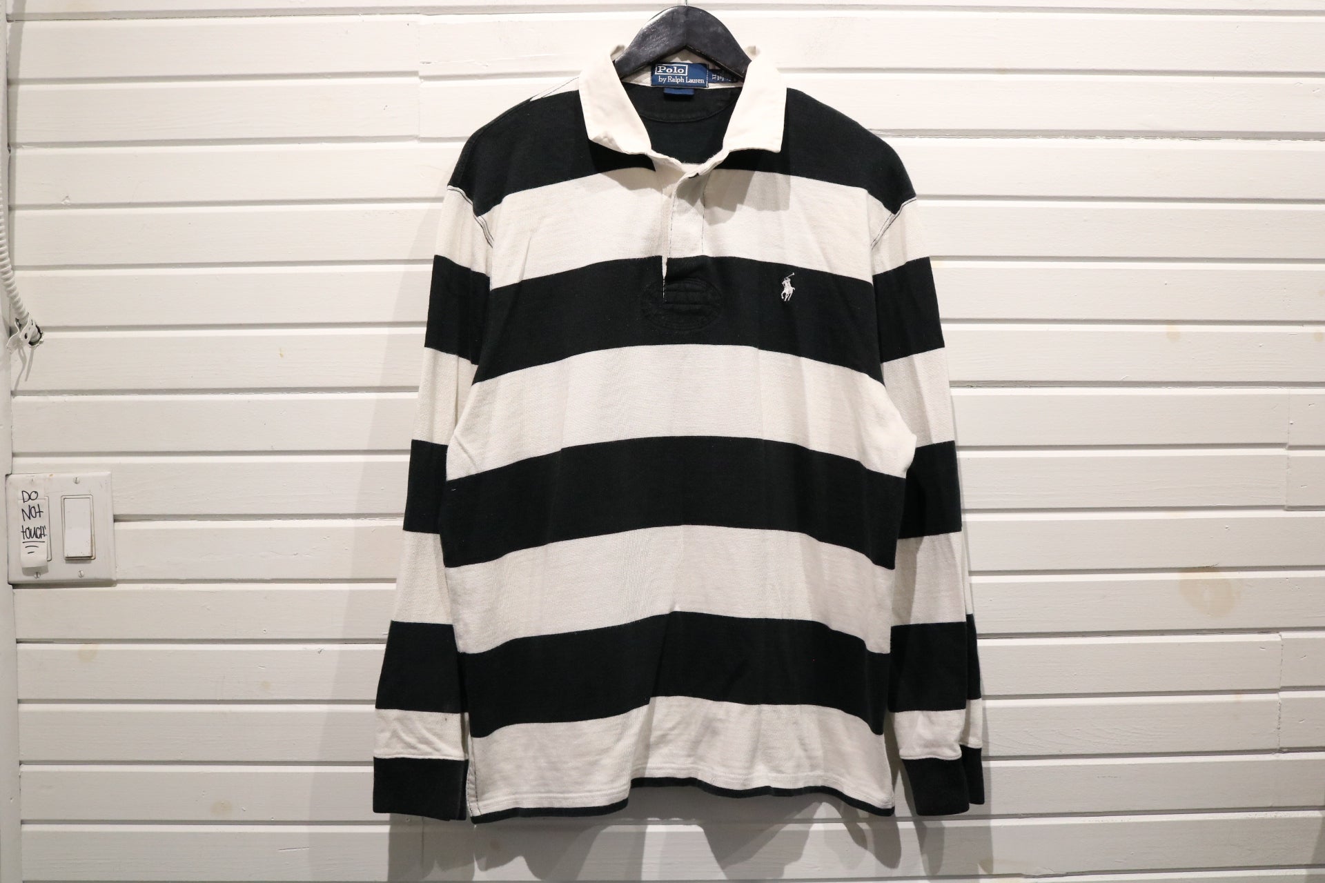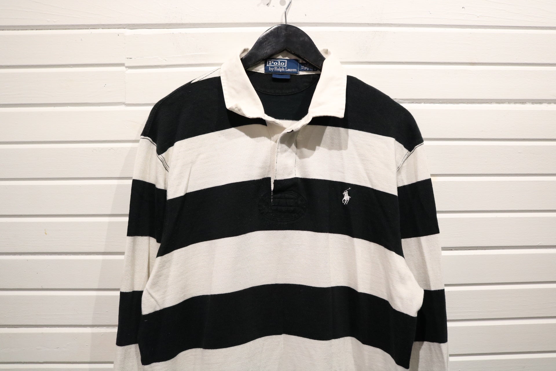 Vintage Polo Ralph-Lauren long sleeve rugby shirt with bold black and white stripes and iconic number 8 patch on the back.
