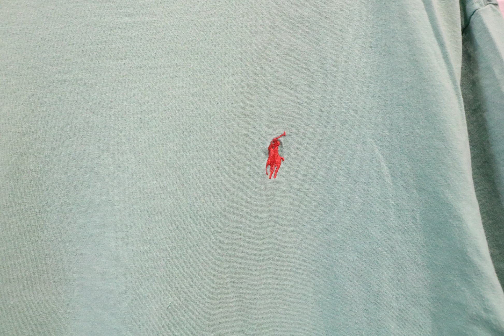 Vintage Polo Ralph Lauren green crewneck t-shirt featuring classic red embroidered logo on the chest.