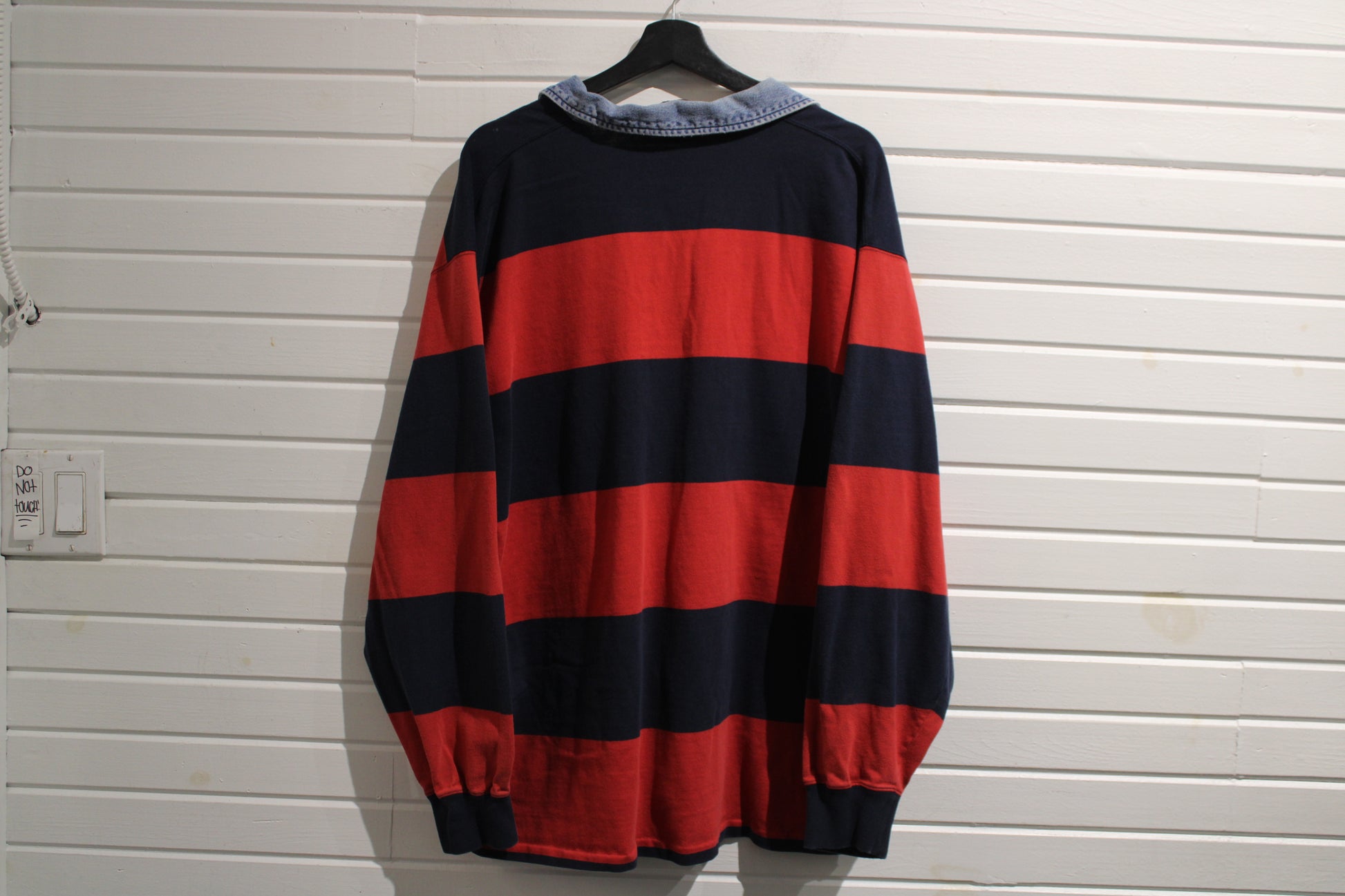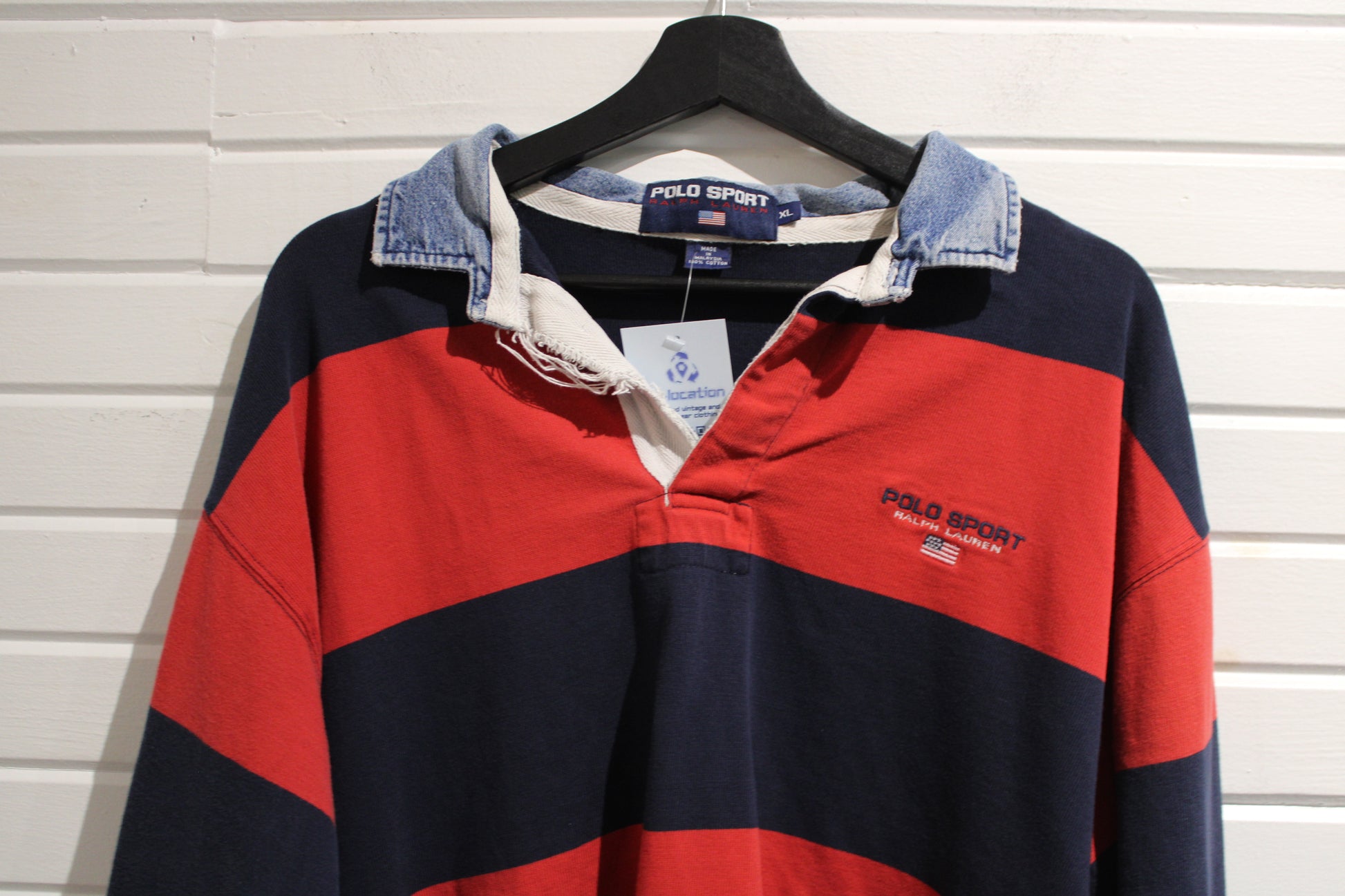 Vintage Polo Sport Rugby Shirt featuring a bold stripe pattern and denim collar