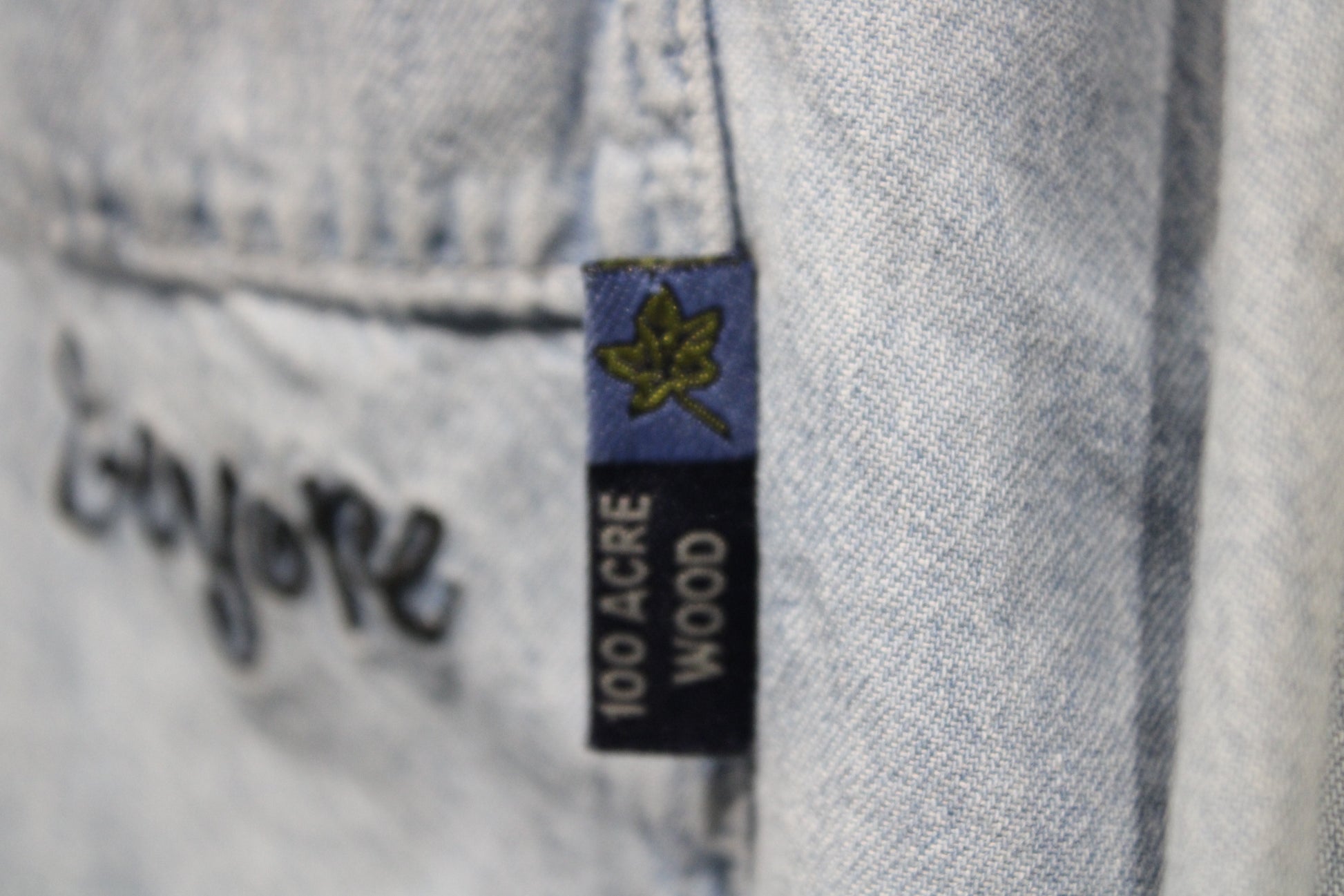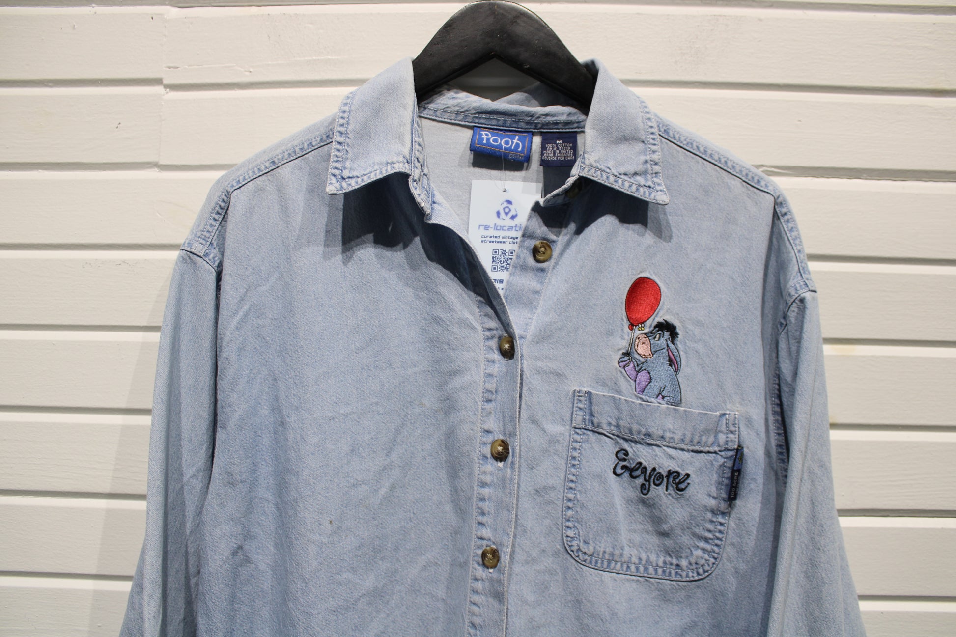 Classic denim button-up shirt featuring an embroidered Eeyore with balloon graphic detail and chest pocket embroidery.
