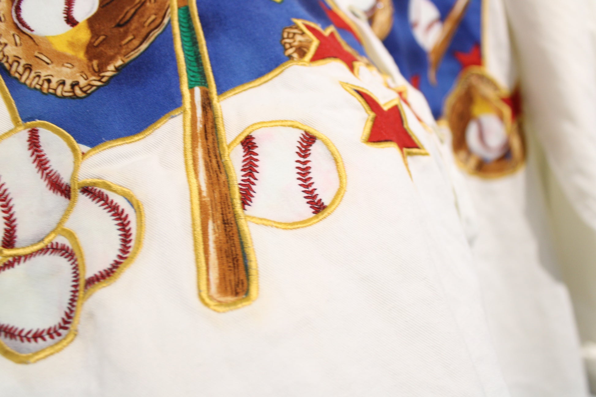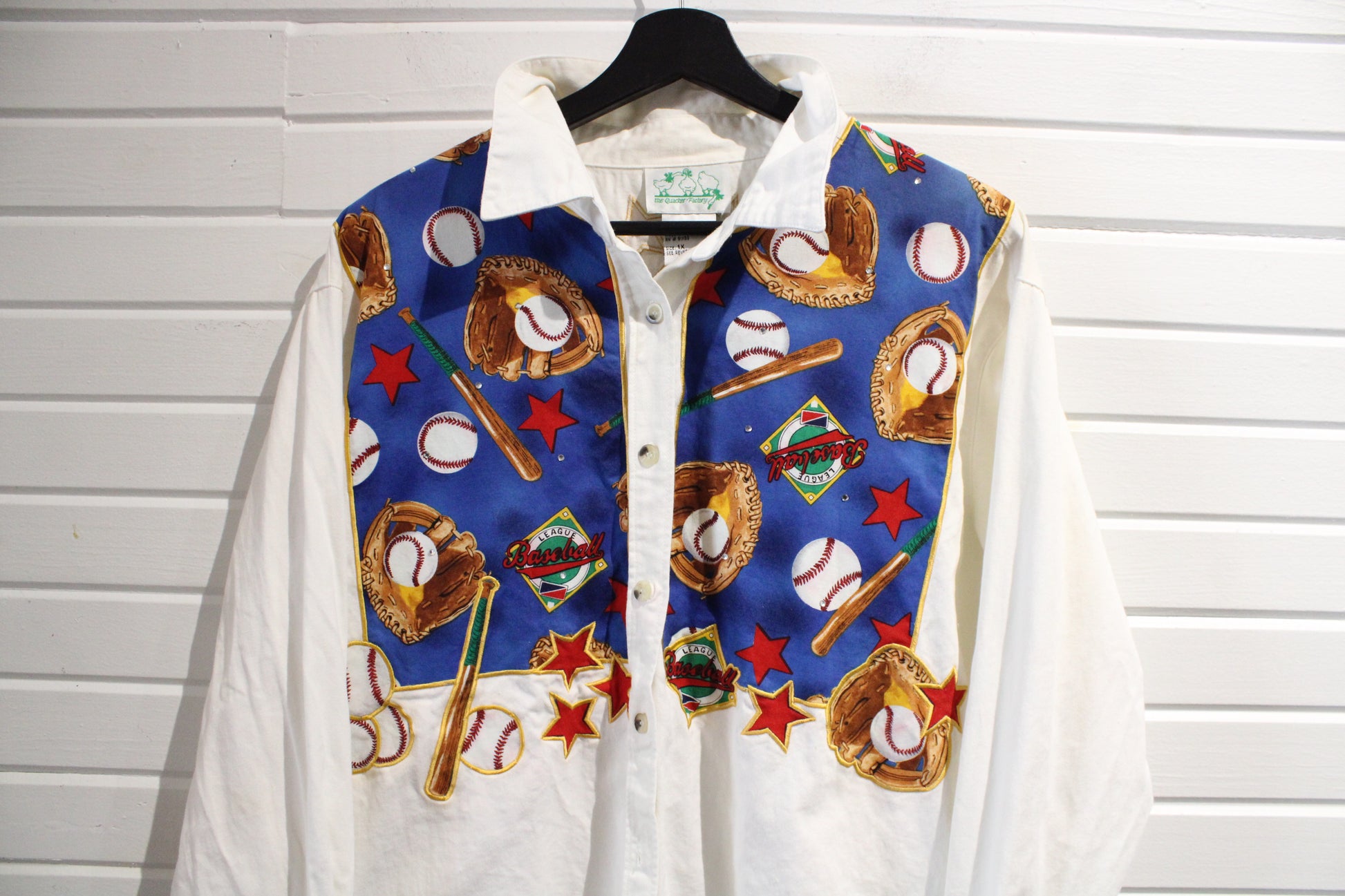 Vintage baseball-themed button-up shirt featuring colorful embroidered gloves, bats, stars, and balls with bold contrast panel details.