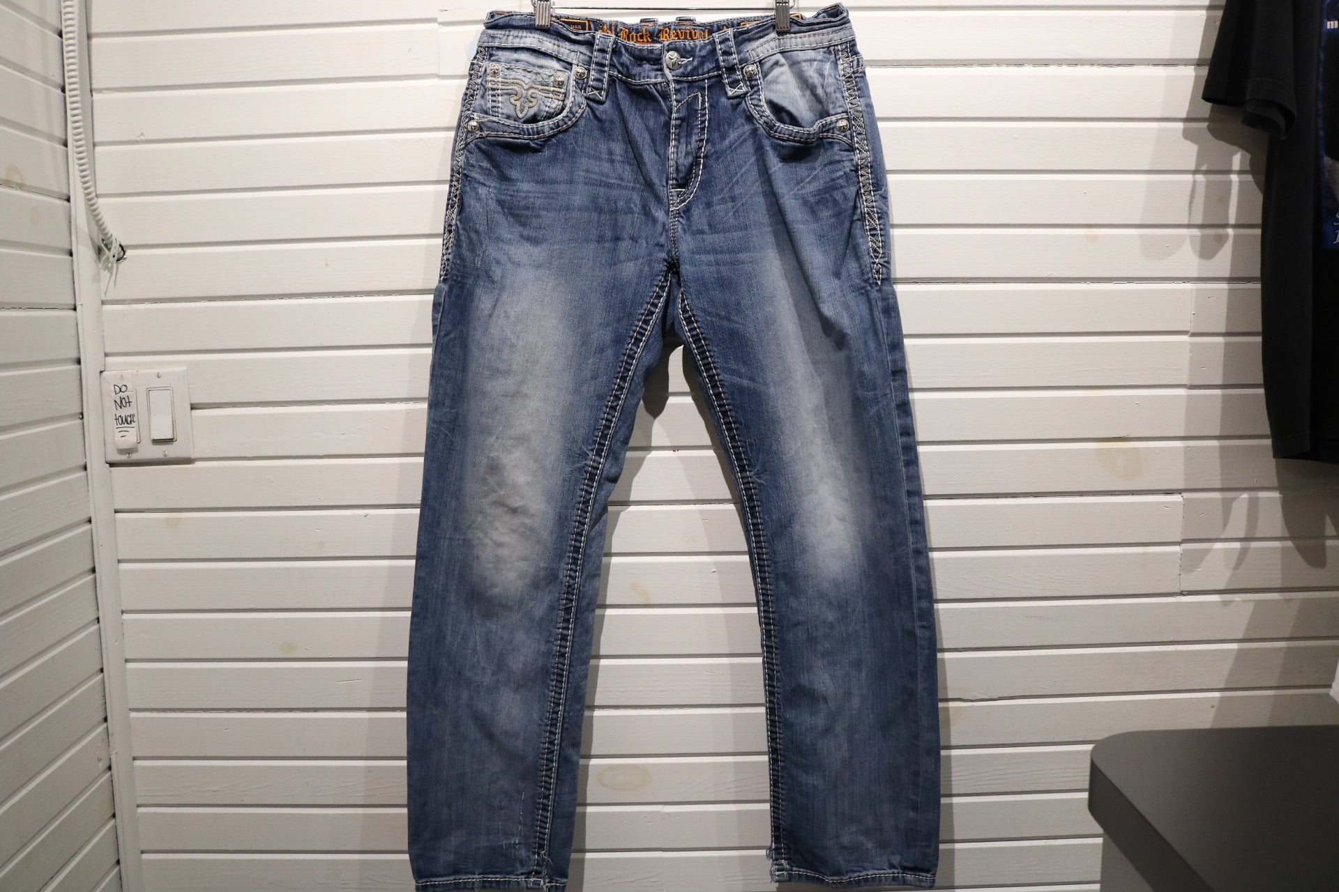 Rock-Revival embroidered straight-leg denim jeans featuring prominent back pocket stitching and signature metal hardware.