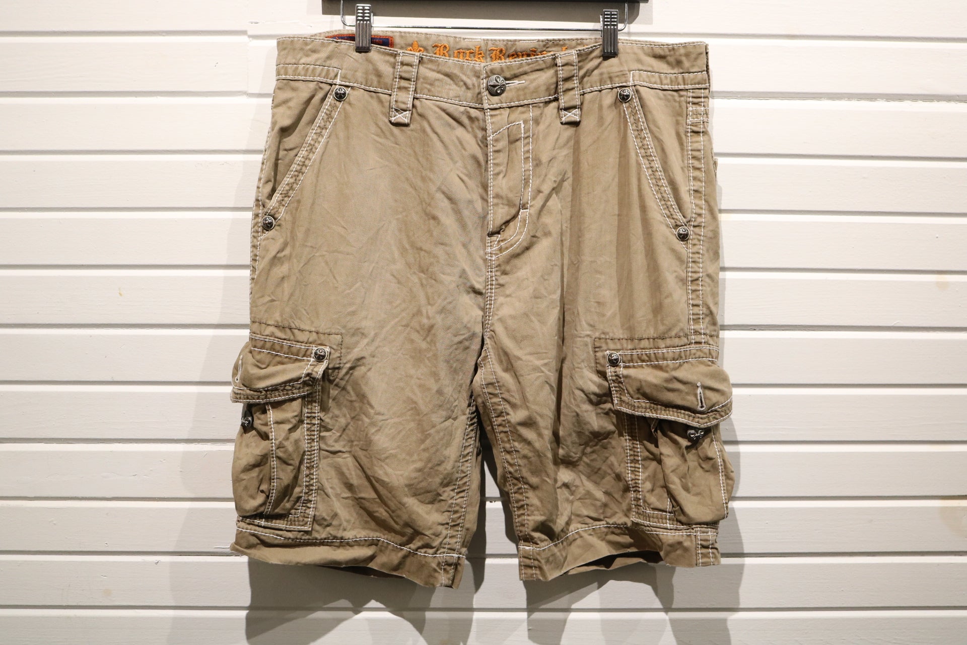 Vintage Rock Revival cargo shorts with embroidered back pockets and classic contrast stitching.