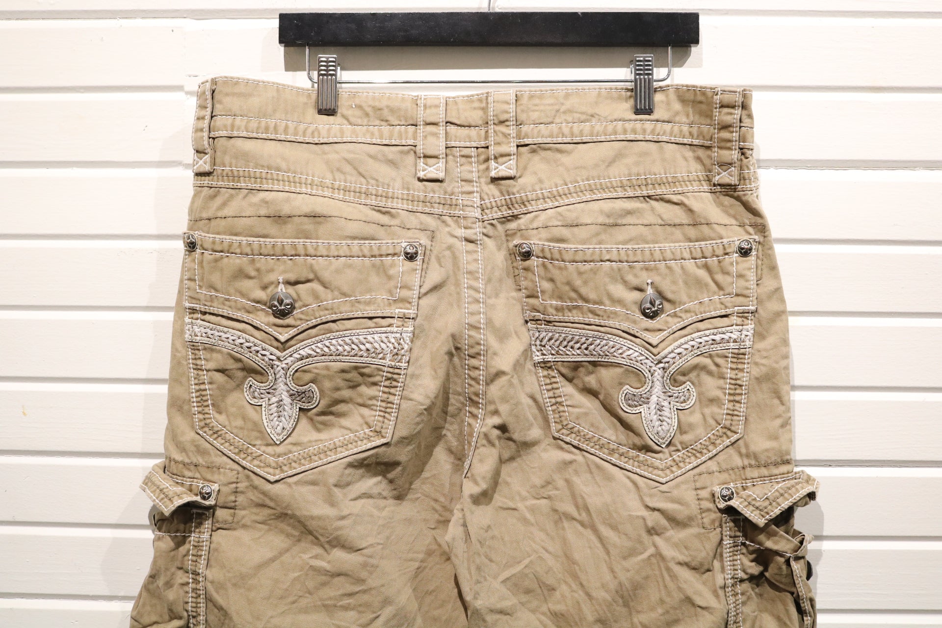 Rock Revival Shorts | Vintage Detailed Cargo Shorts with Embroidered Pockets | Fleur De Lis Streetwear Bottoms