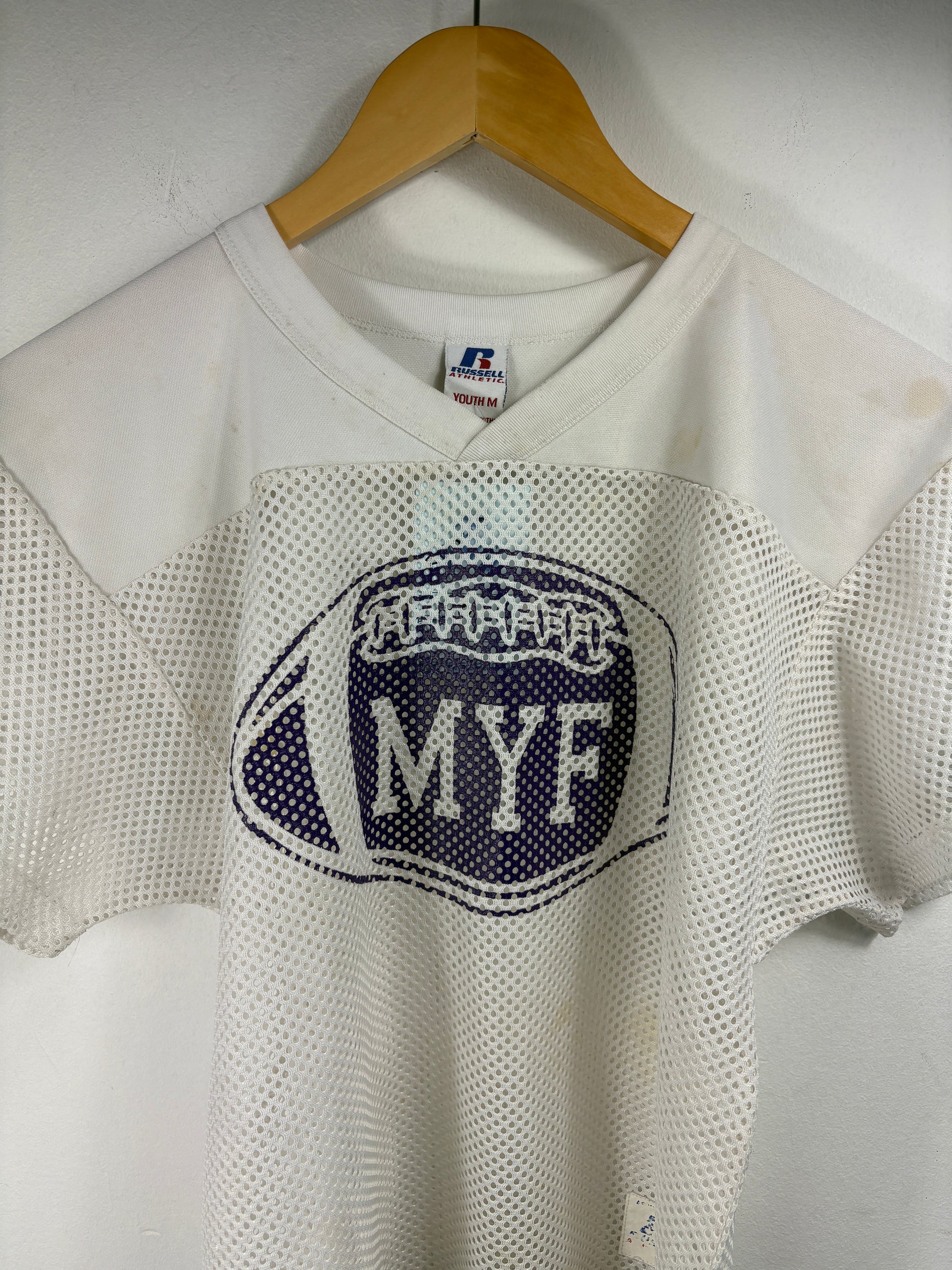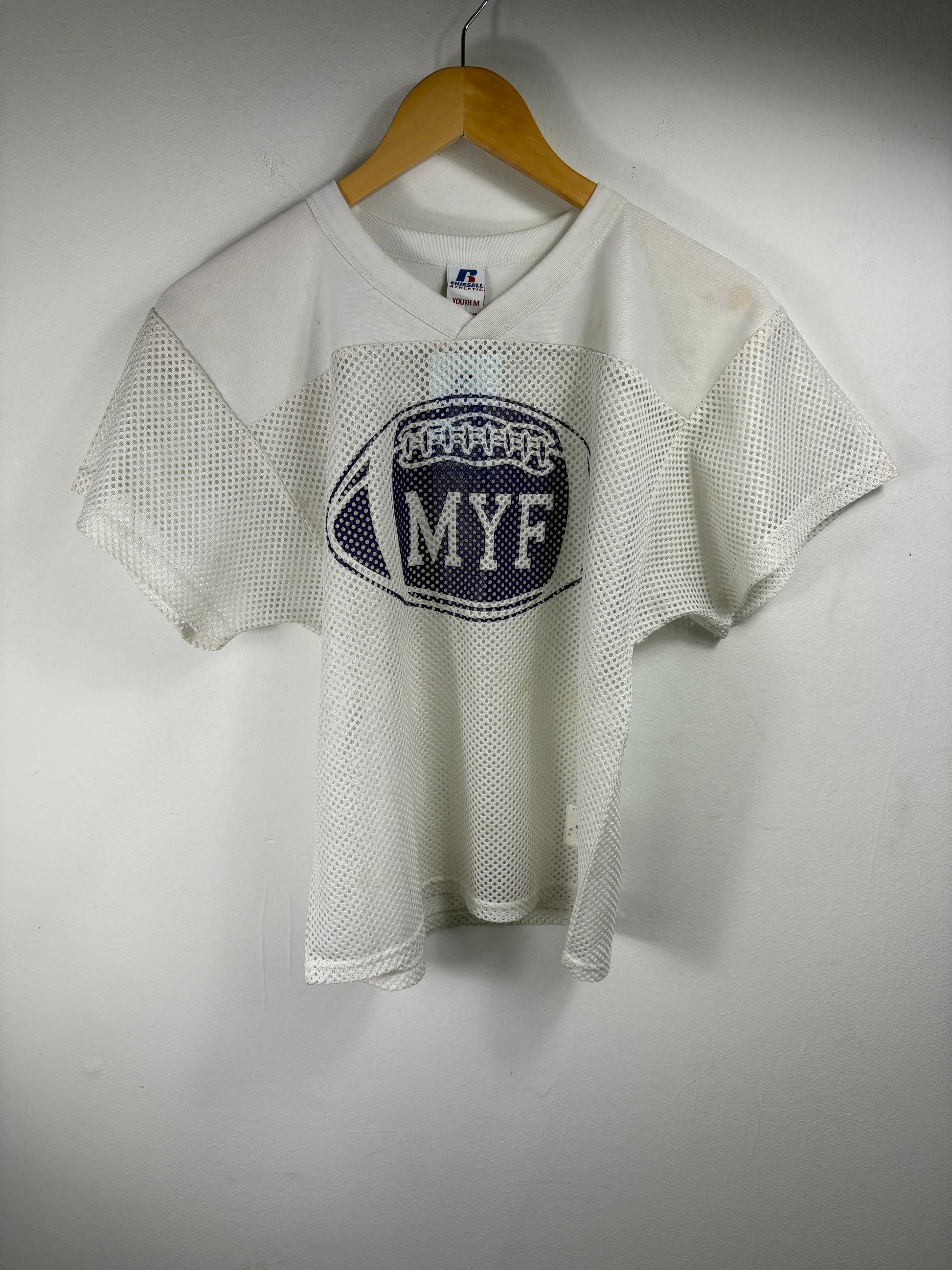 Vintage Russell-Athletic MYF mesh football jersey in white with bold printed front logo, lightweight and perfect for athletic use.