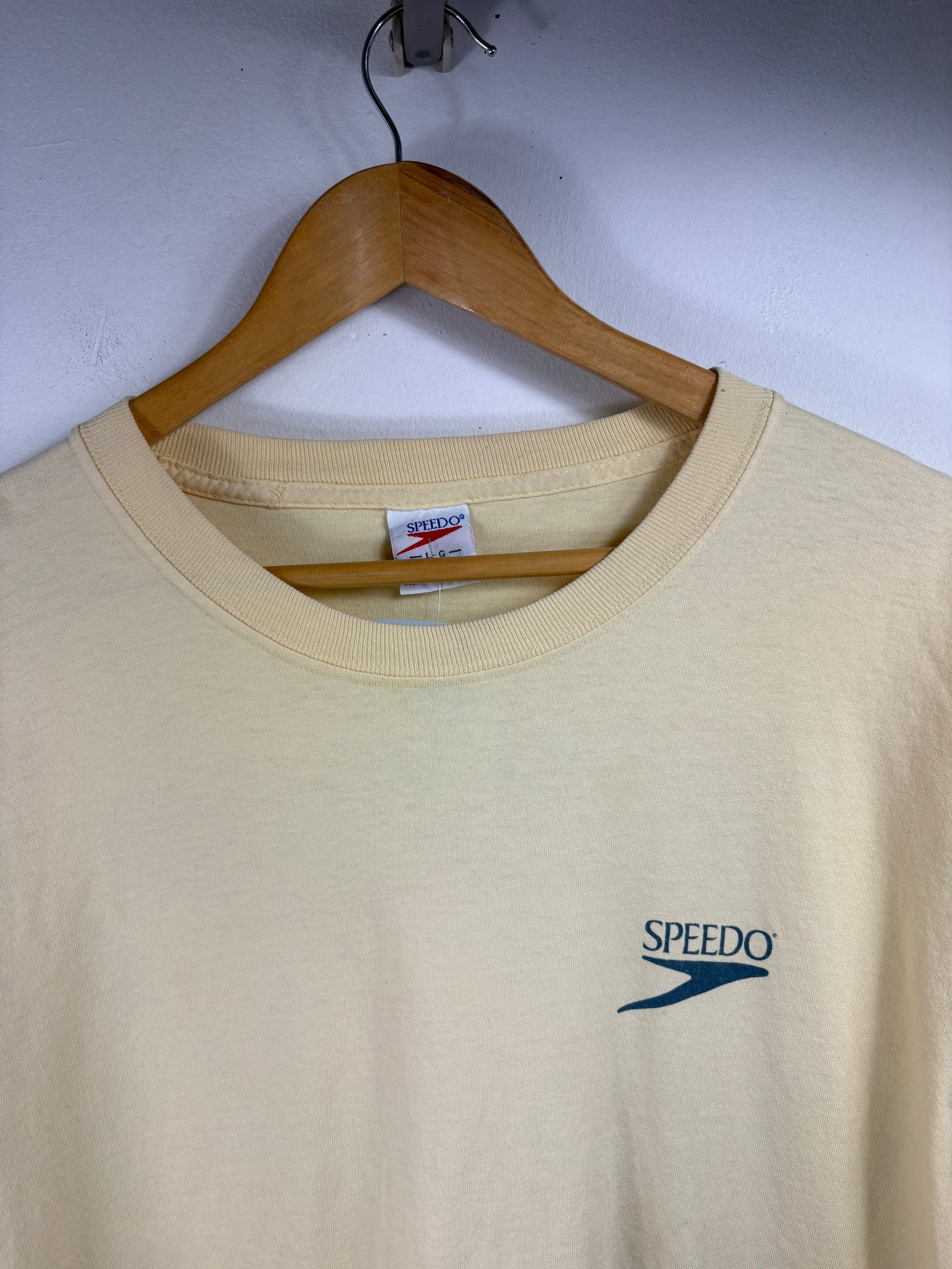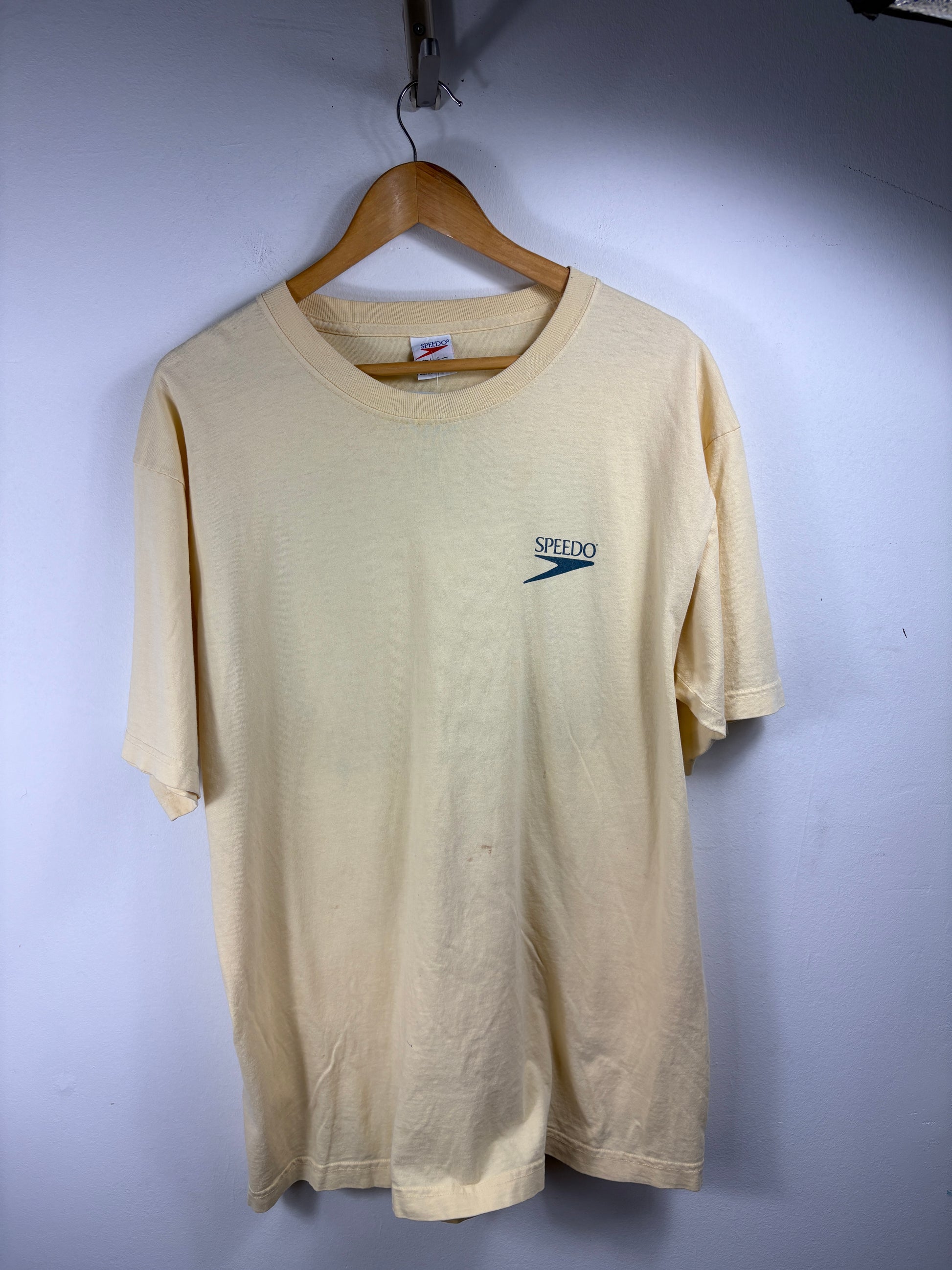 Vintage Speedo tee featuring a lifeguard tower and beach scene on the back with a Speedo logo on the front chest.