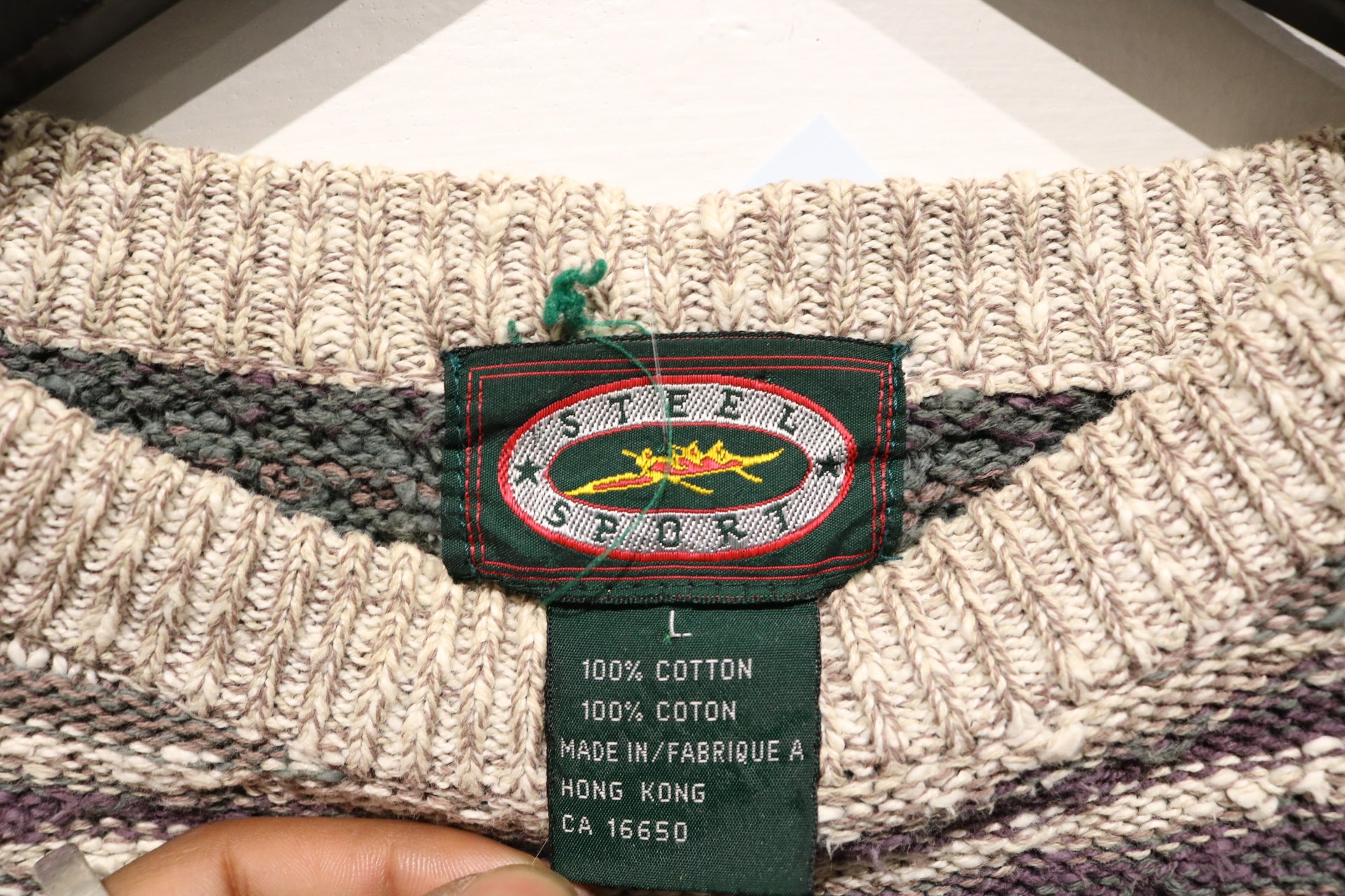 Steel-Sport Sweater | Vintage 90s Textured Pattern Knit Pullover | Classic Striped Knitwear