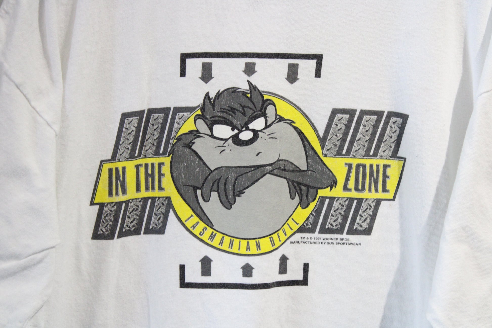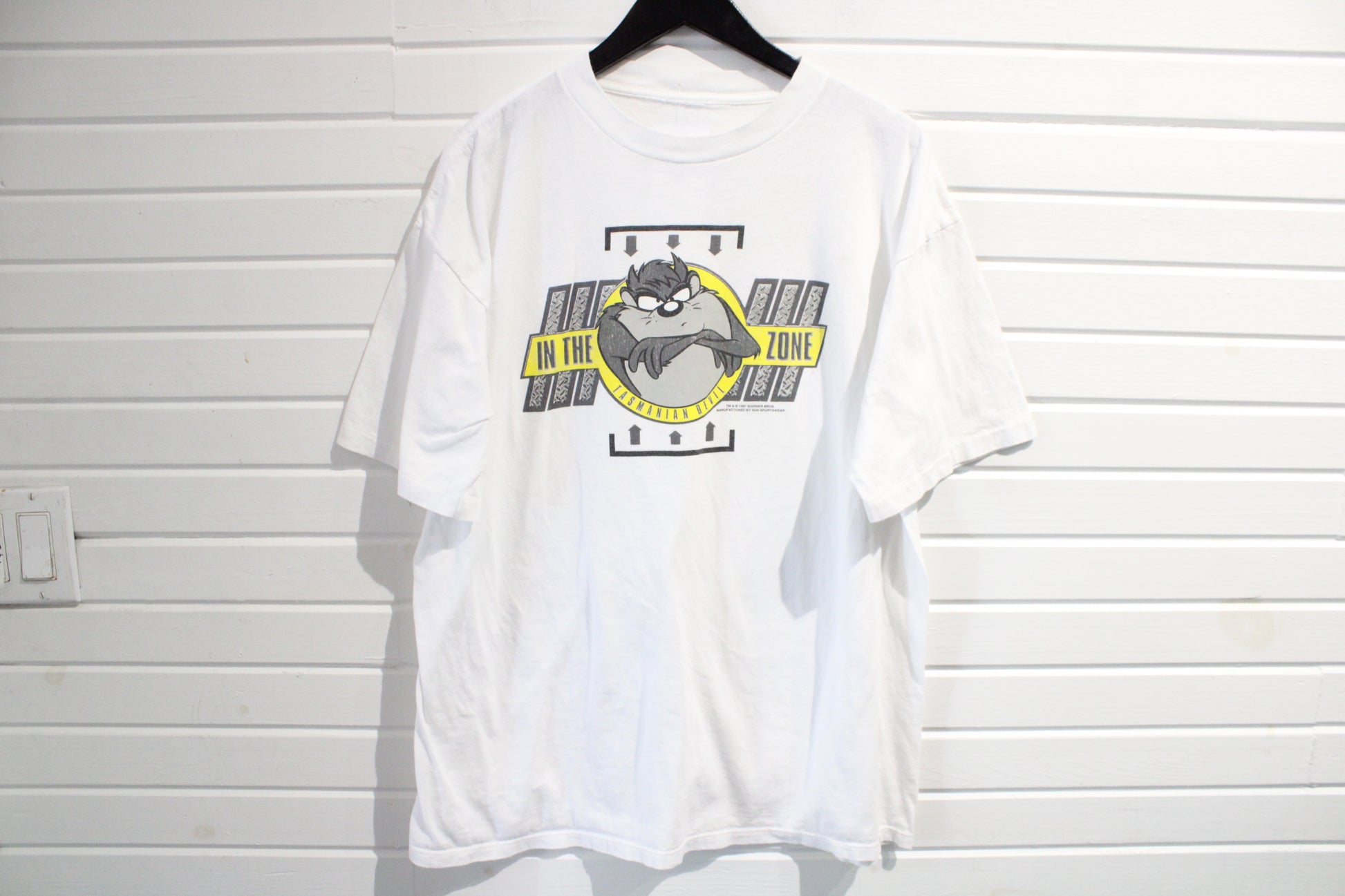 Vintage Tasmanian Devil Looney Tunes T-Shirt featuring a bold 'In The Zone' graphic from 1997.