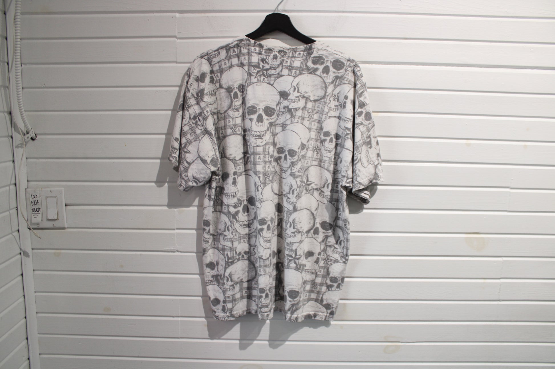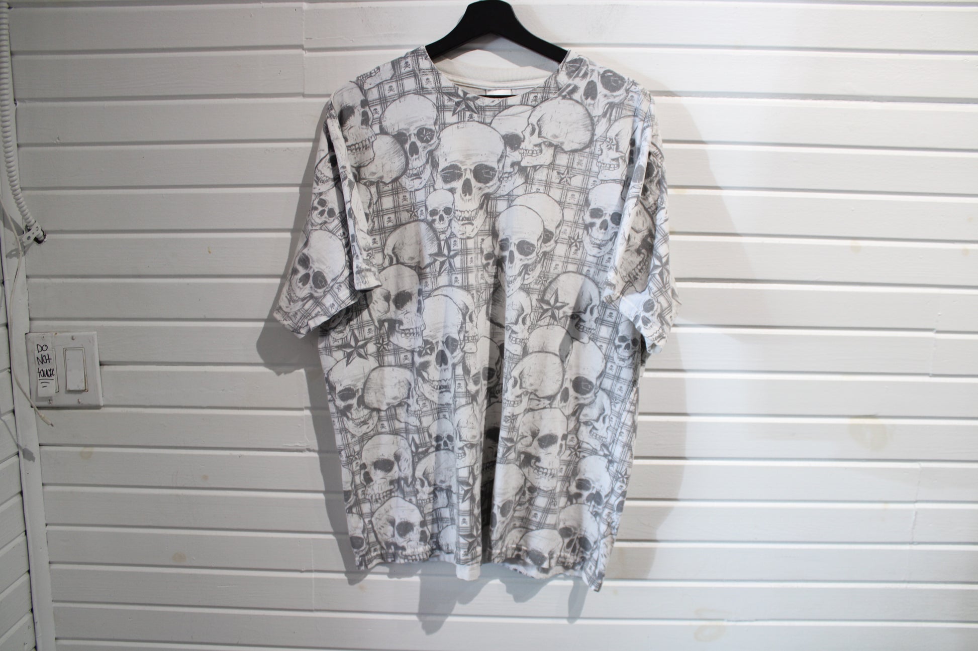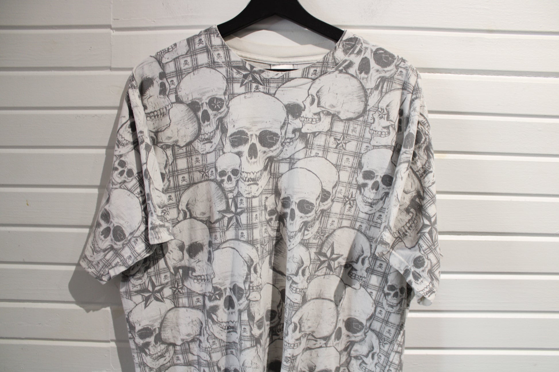 Vintage skull and crossbones all over print T-shirt with grunge graphic style.
