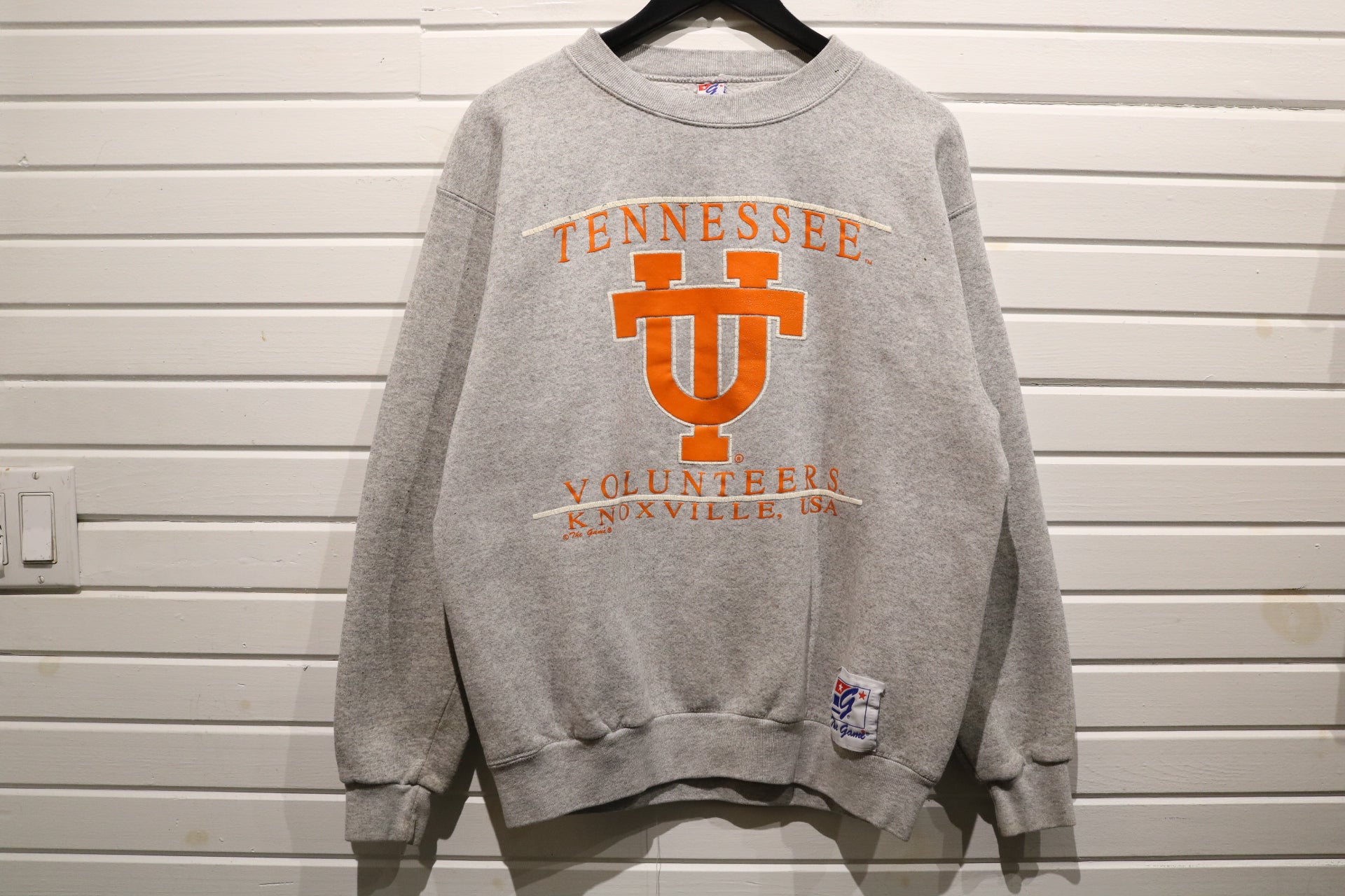 Classic Tennessee Volunteers grey crewneck sweatshirt with bold orange Knoxville university graphic.