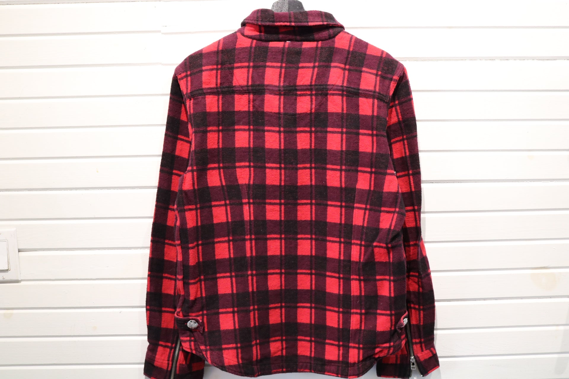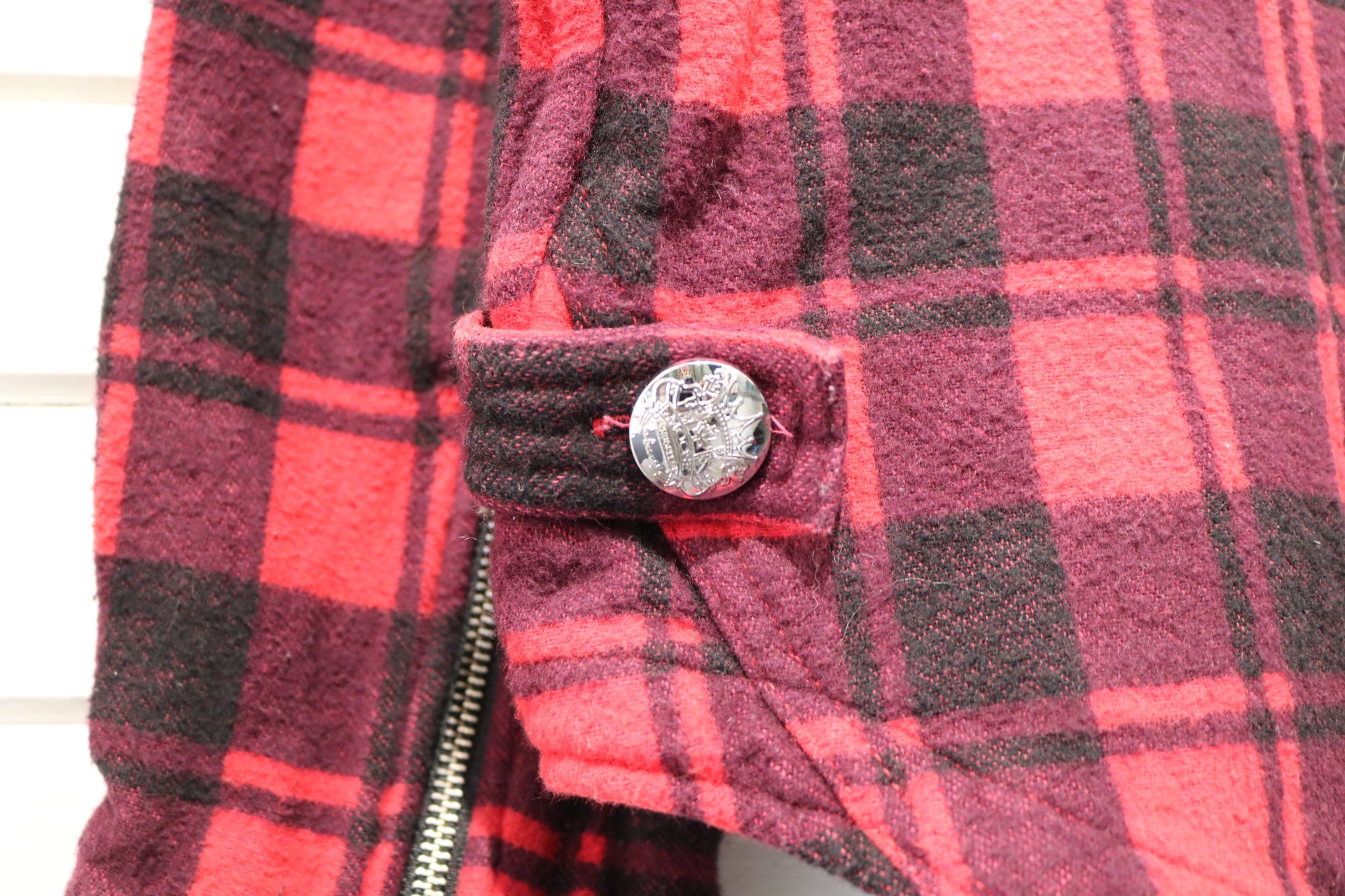Vintage red and black plaid button-up shirt jacket with metal accents and zippered cuffs.